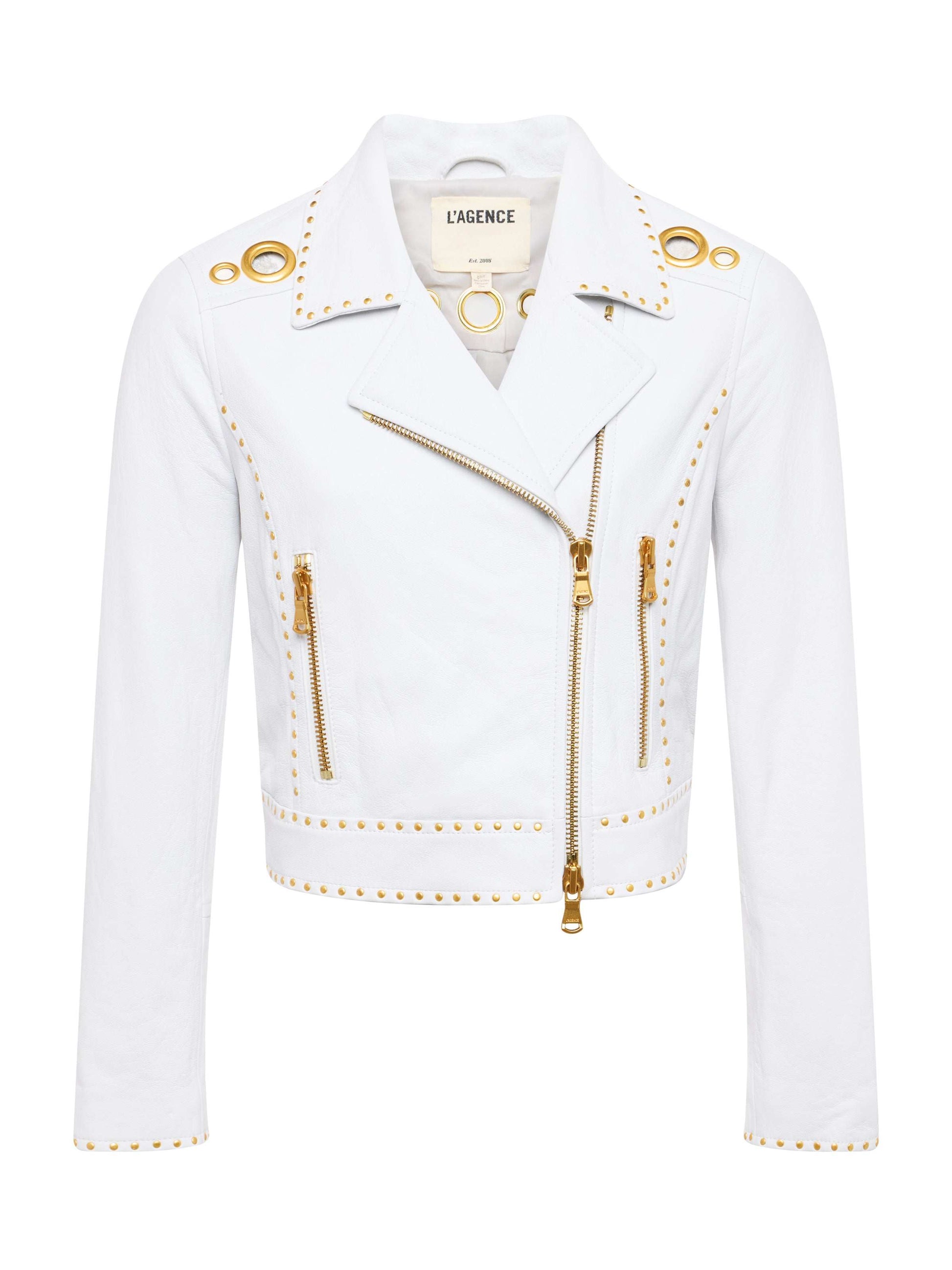 City chic with a bold edge, the Aelin is a cropped white leather jacket, featuring gold studs, grommets, and zippers. Sleek and statement-making—it’s your shortcut to cool.