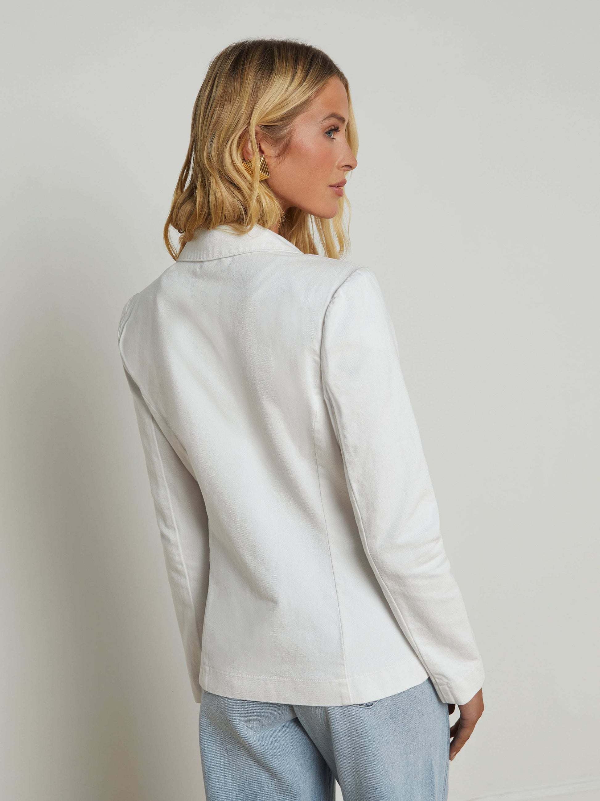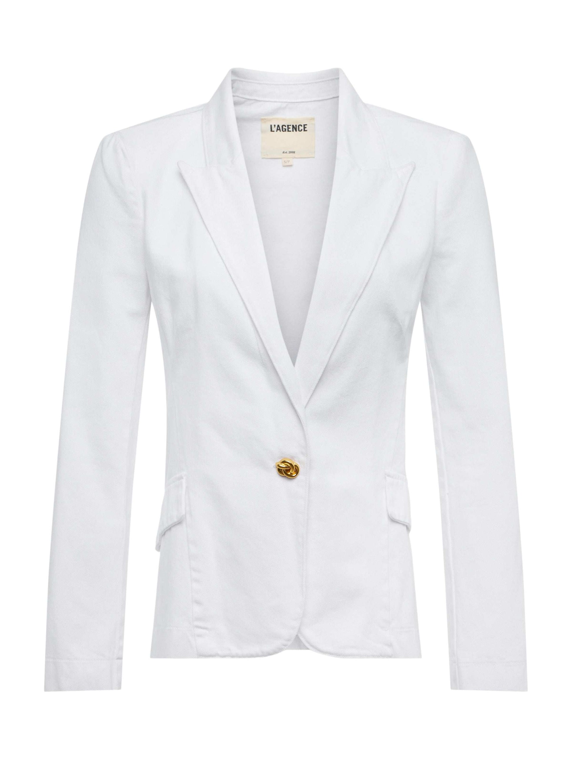 Our classic single-breasted blazer is now back in white denim with an antique knot button.