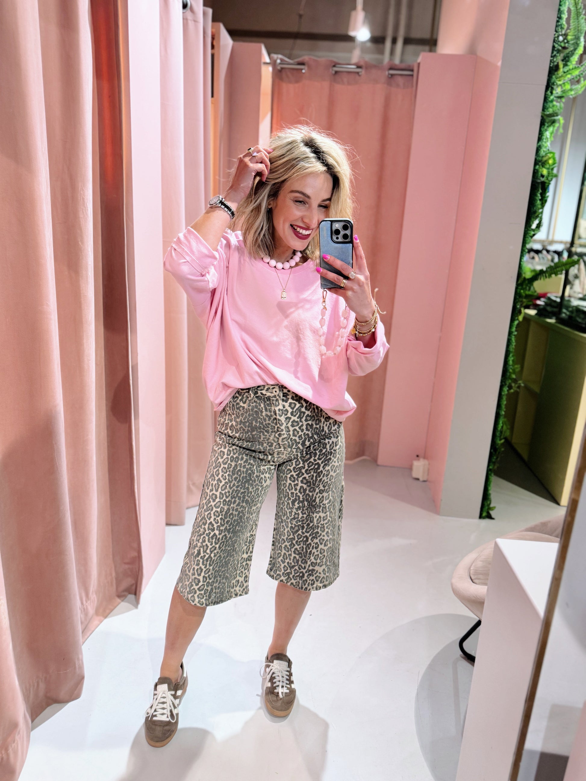 Deze denim jorts met hoge taille heeft een knoop- en ritssluiting en meerdere zakken. Het item heeft een loose fit, valt net boven de knie en is afgewerkt met een leopard dessin, waardoor het een échte eyecatcher is!