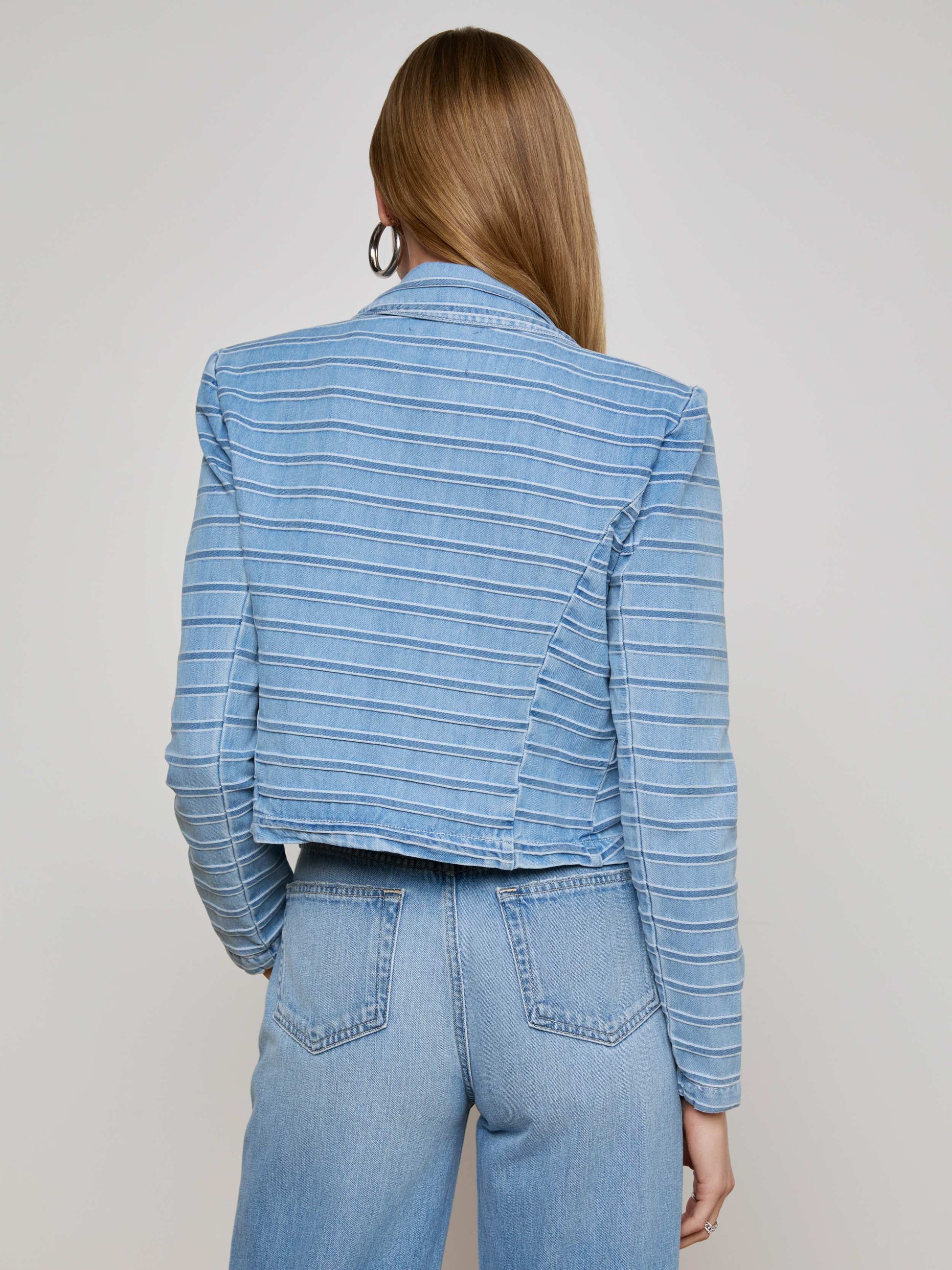 Meet your warm weather denim blazer. This striped jacket is the perfect layer to throw on over all your spring to summer looks from the office to brunch.