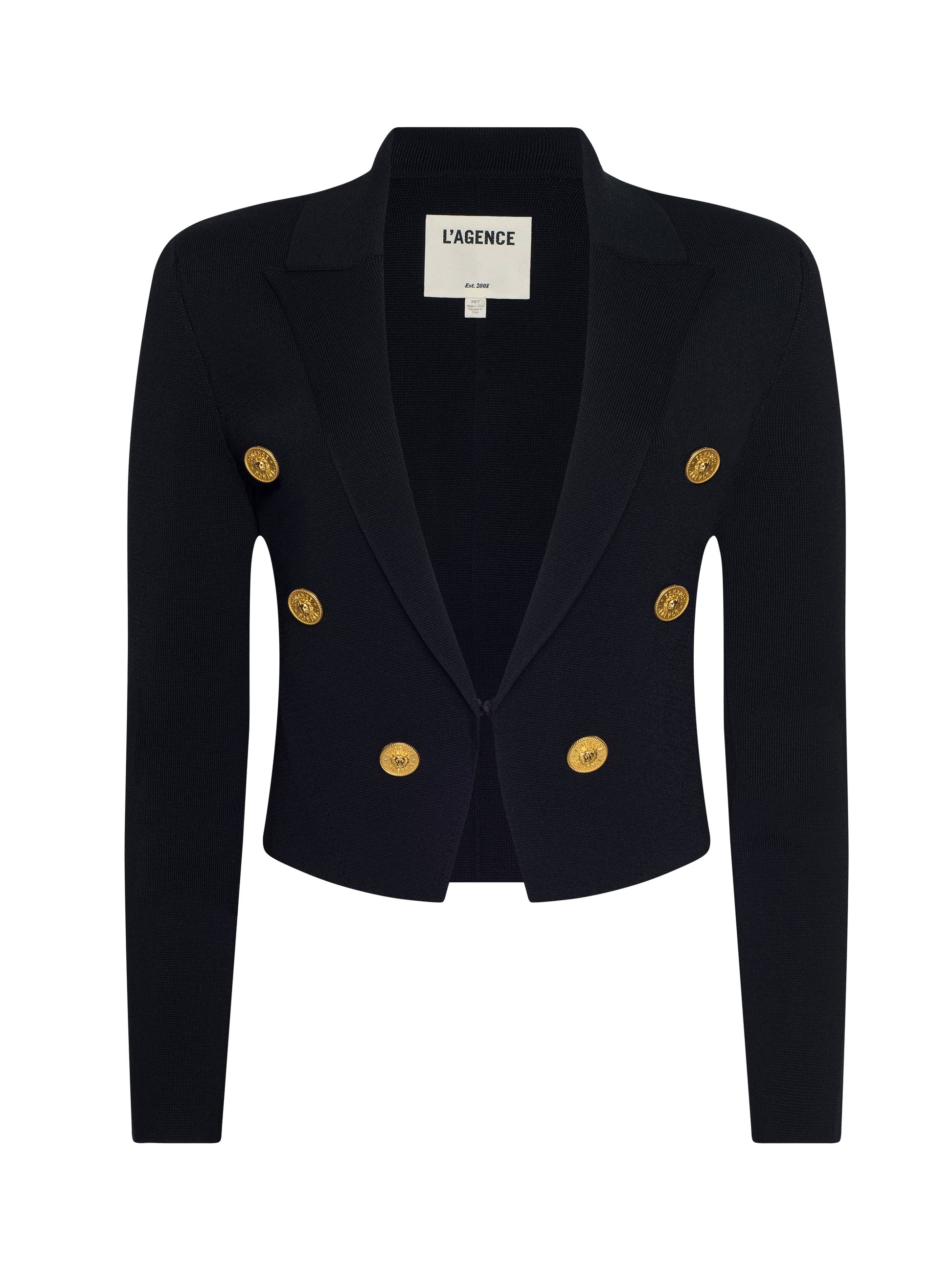 Instant polish, with comfort. The Elio is a cropped knit blazer that blends structure with softness. Finished with gold buttons and a curved hem, it’s your answer to looking tailored yet relaxed. Now in timeless black.