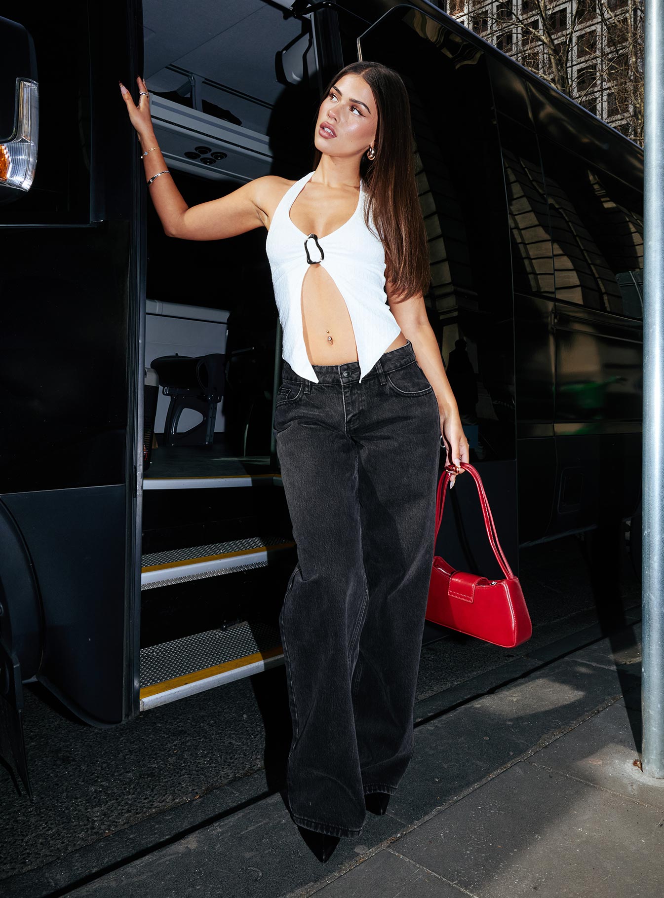 - Low-rise slouch denim jeans
