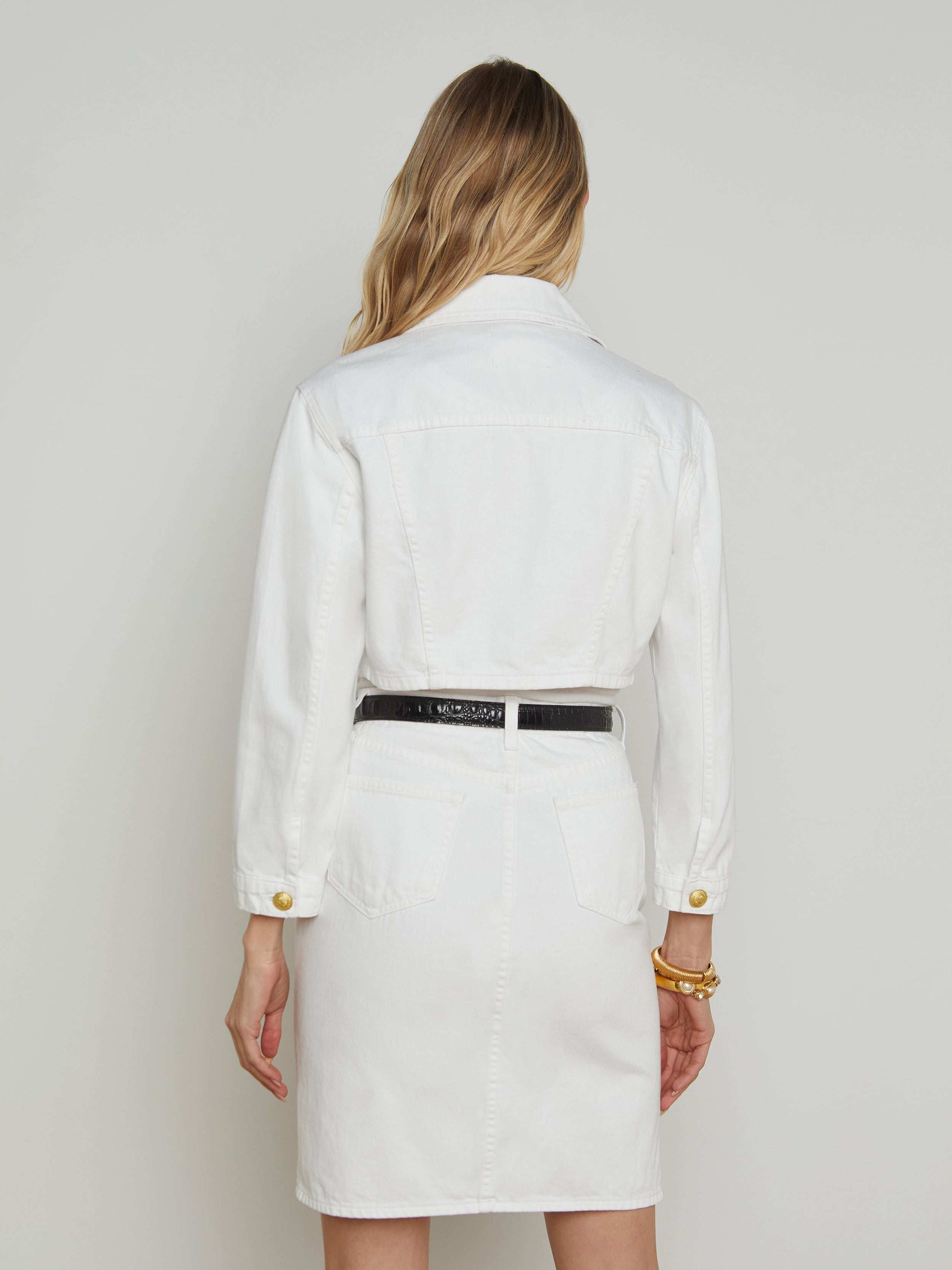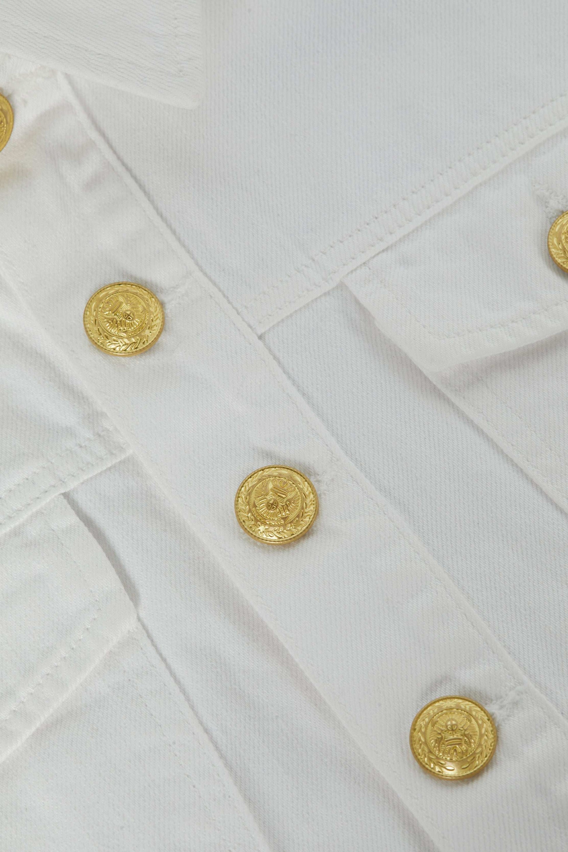 Our signature three-quarter sleeve jean jacket is reimagined in an ultra cropped cut, now in a timeless white. Embossed dome buttons add a pop of glamor.