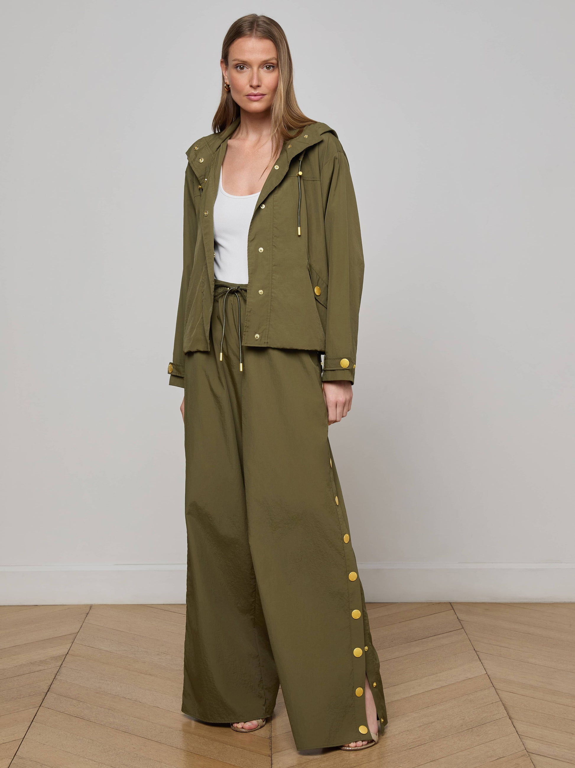 Cool, chic & functional. The Geovana windbreaker is constructed with a water repellant finish, a drawstring hood, and elevated hardware. A travel must-have and year-round essential.