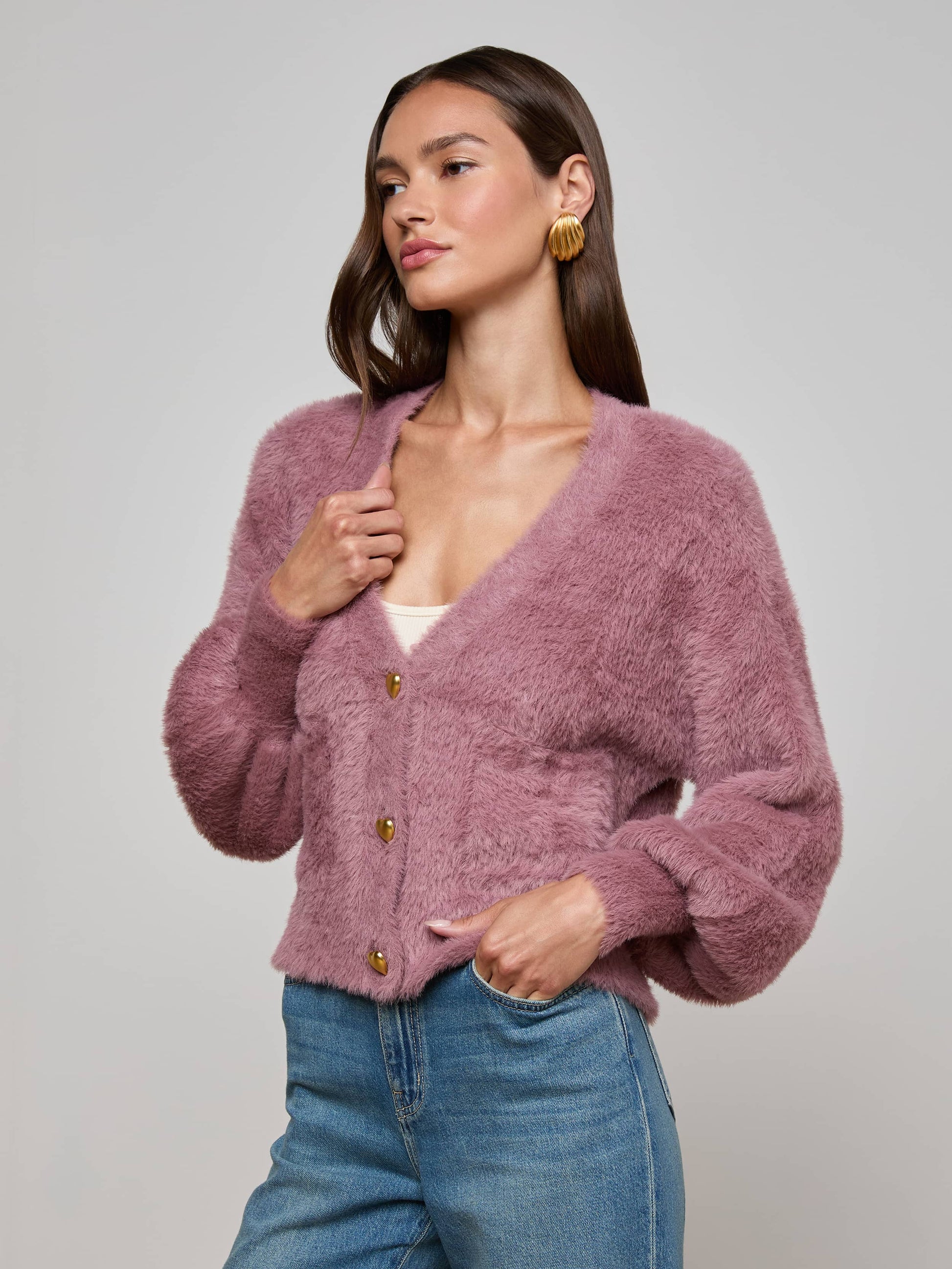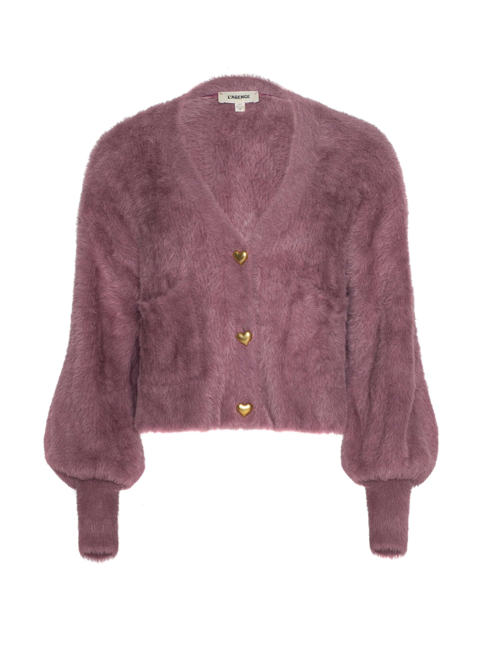 The super soft, cozy-chic cardigan to layer over everything and live in all season long. Now in mauve with gold heart buttons for a romantic touch of glamour.