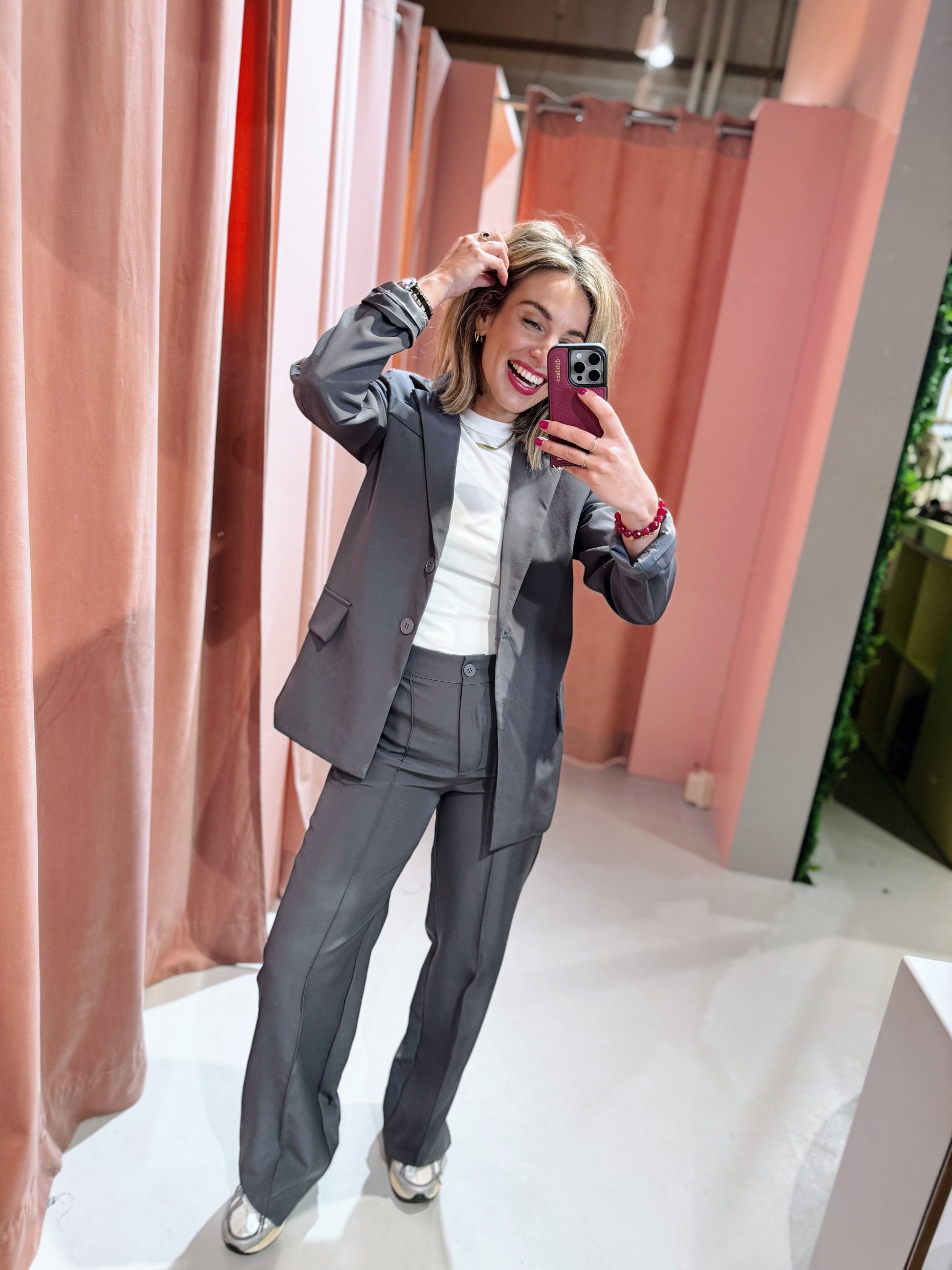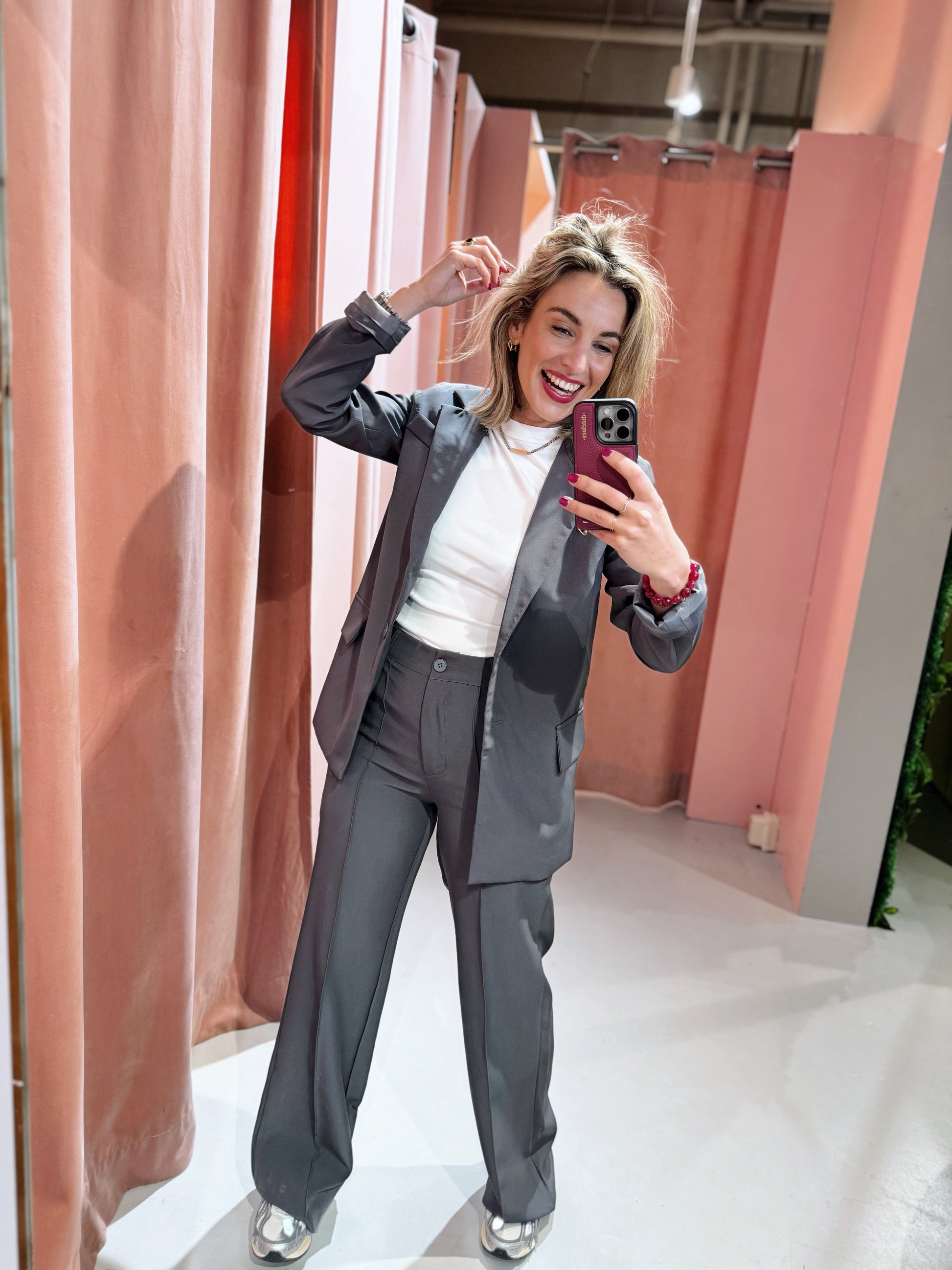 Ben je bekend met onze favoriete pakken? Zoals de Sophie pakken uit ons vorig seizoen? We hebben de broek aangepast. De stof is steviger, er zitten (nep) zakjes op de kont en... het belangrijkste... de pasvorm is aangepast. De broek valt nu OP MAAT! Jessica draagt hier een maat S.