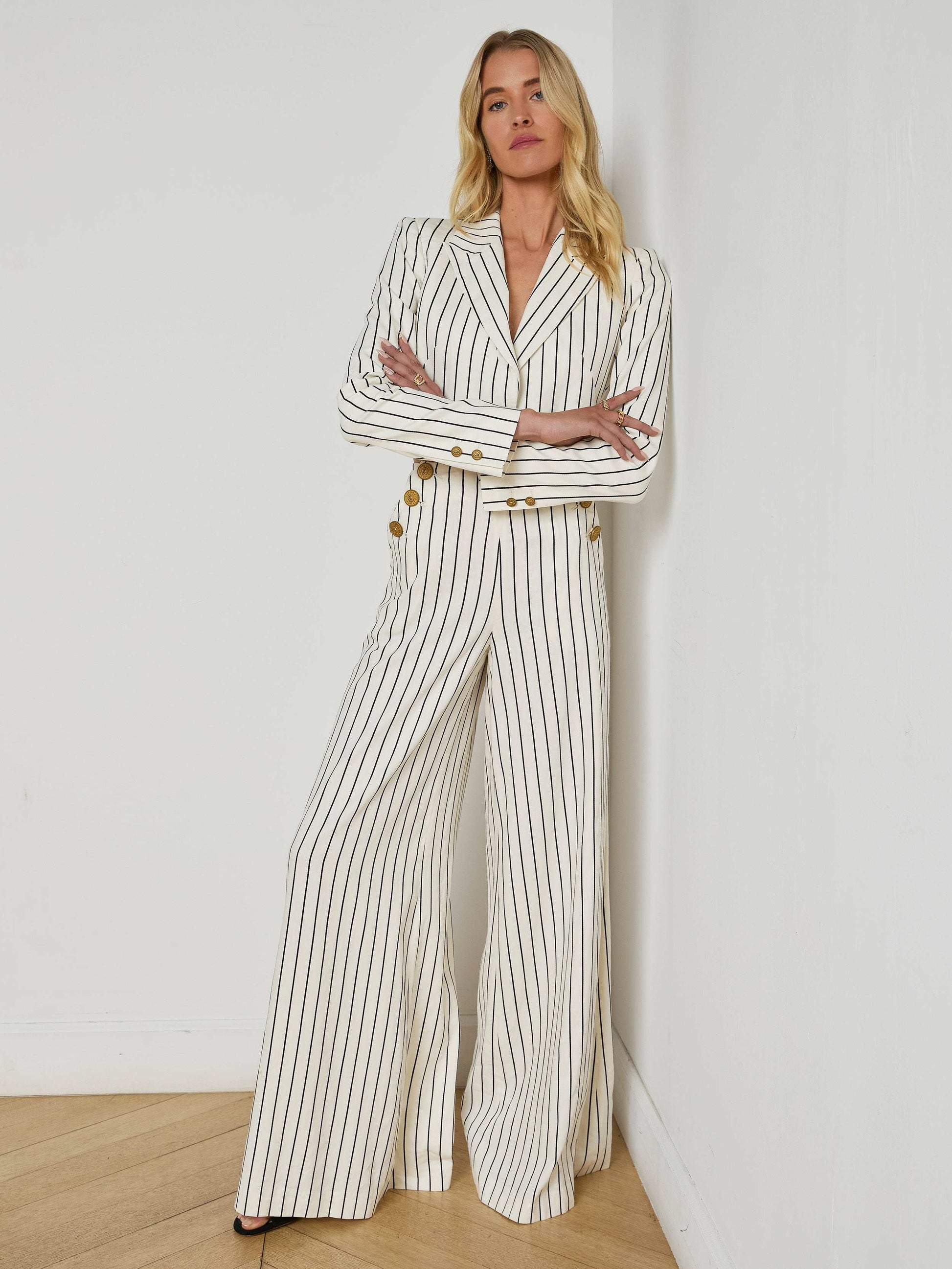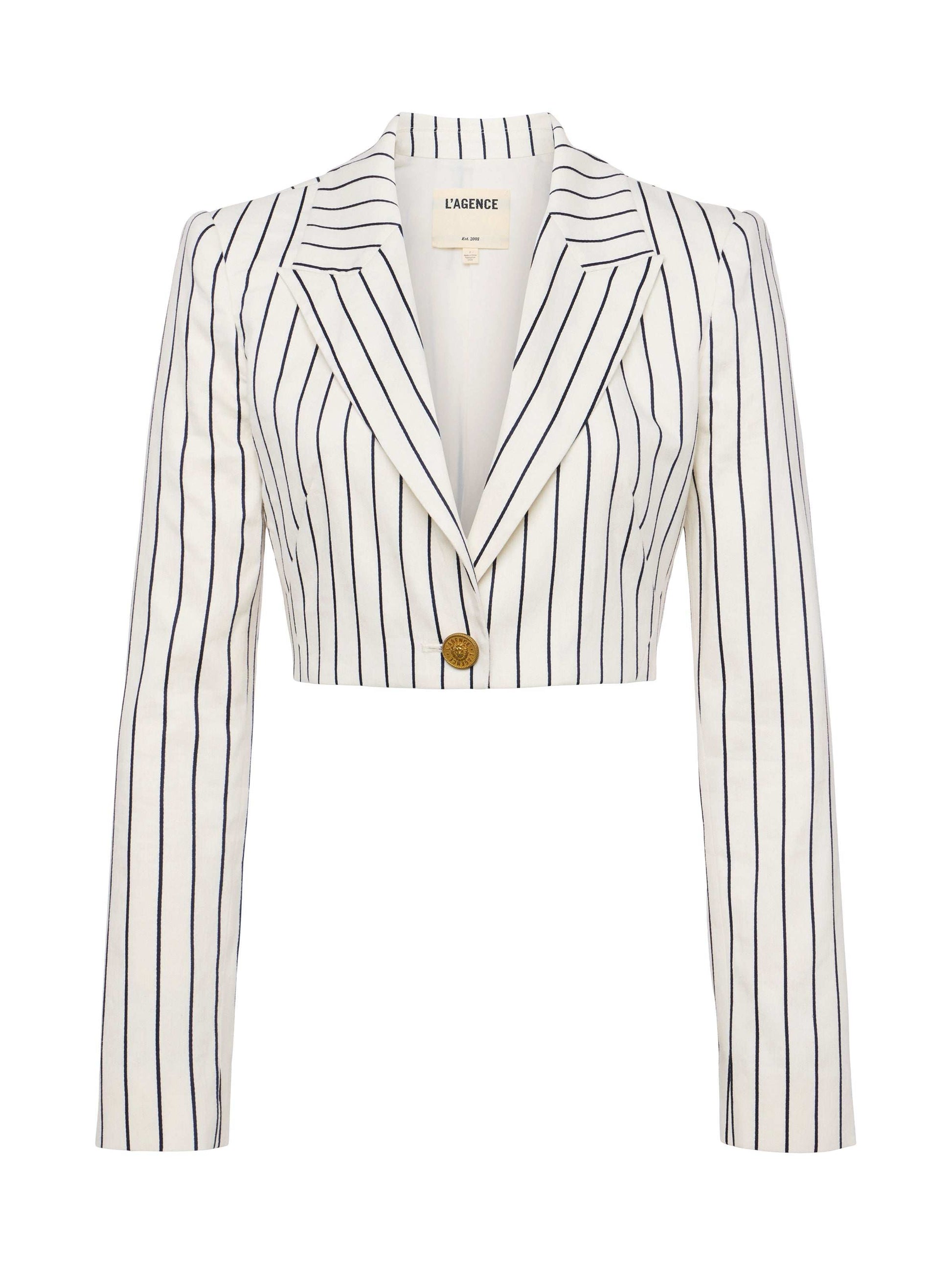 Ultra cropped and ultra chic, the Izzie blazer features classic pinstripes and a gold statement button.