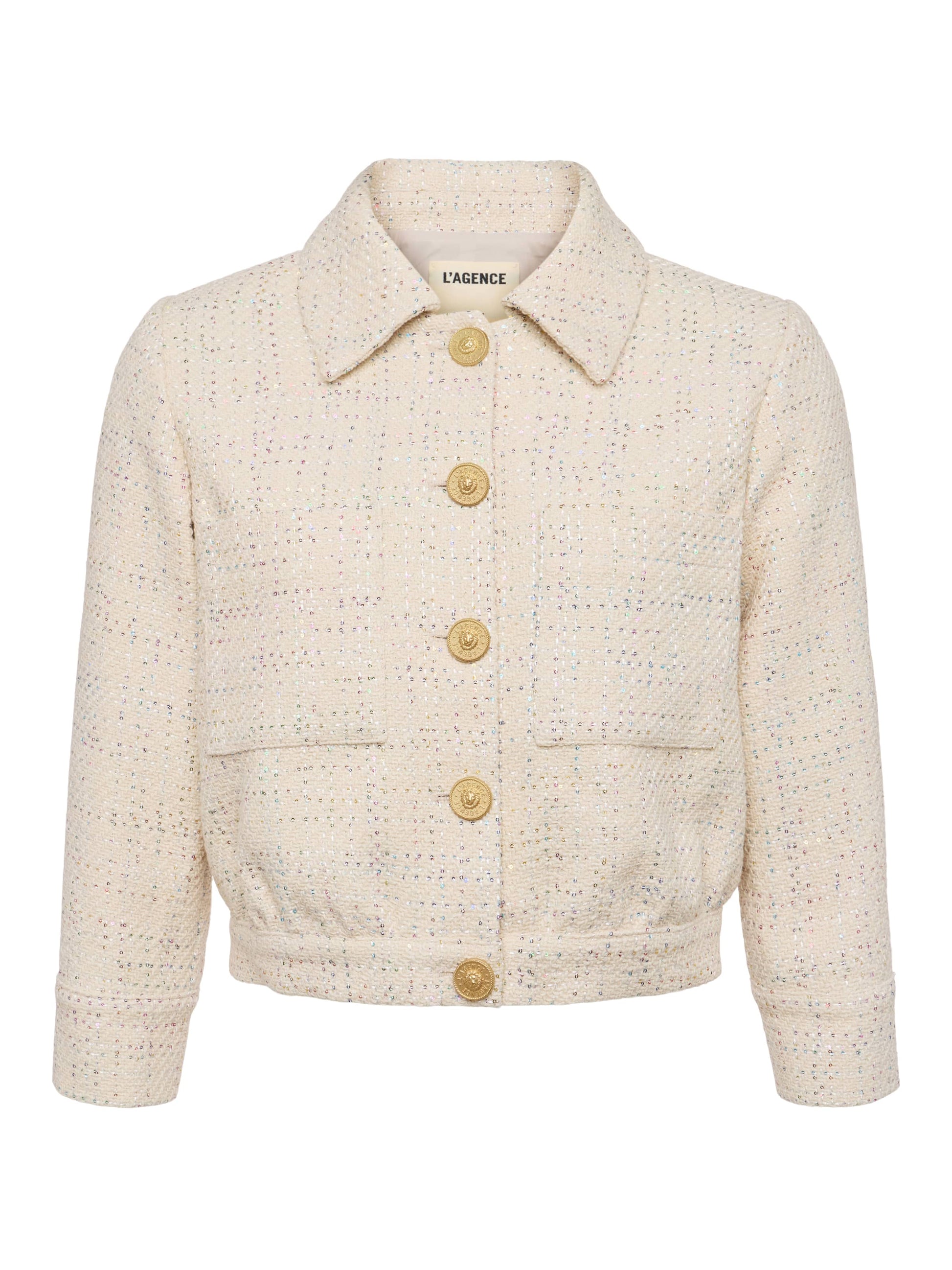 A ladylike, three-quarter sleeve jacket crafted from an ecru tweed embedded with colorful micro sequins. Wear the Jia as a top or second layer.