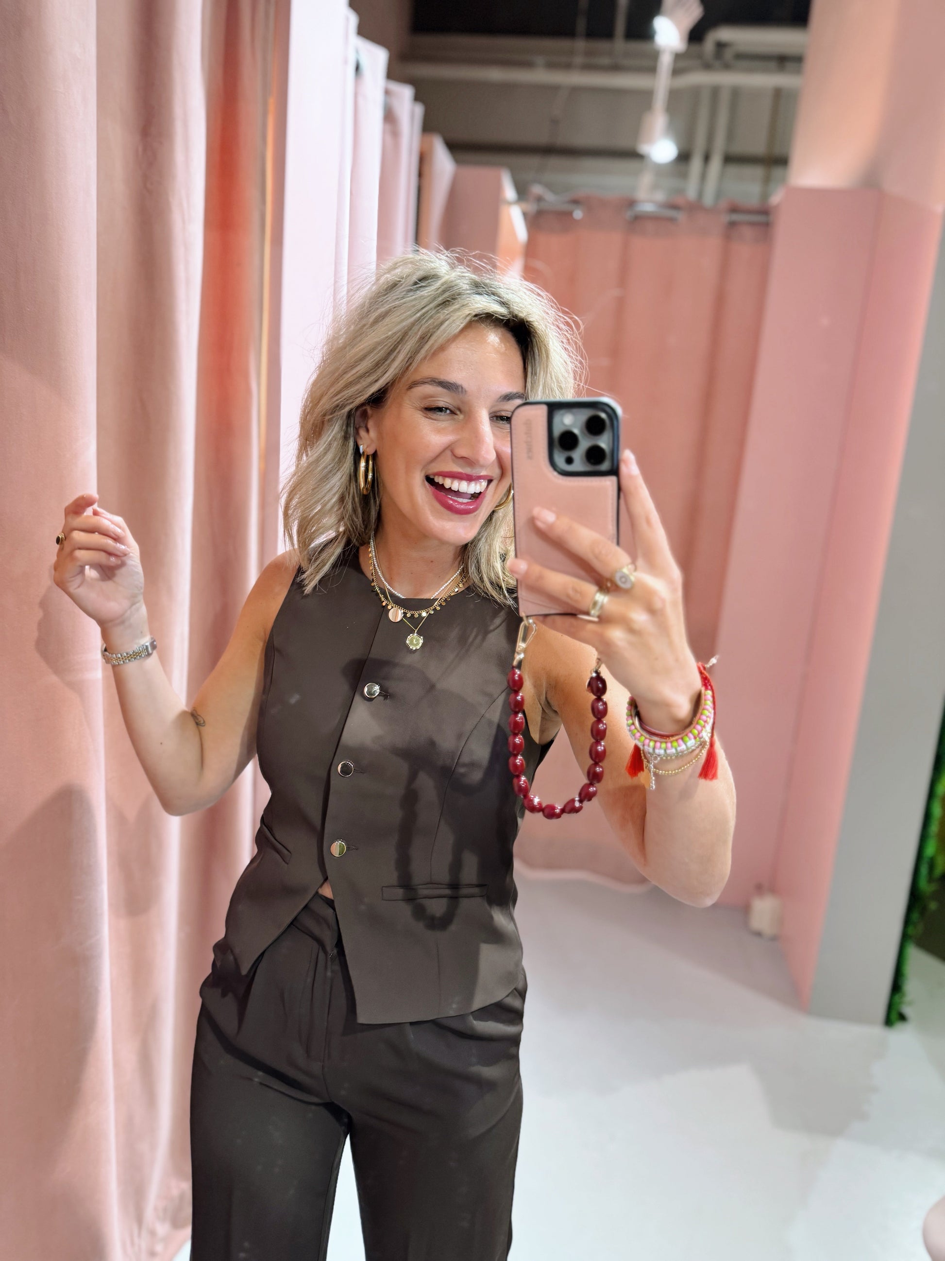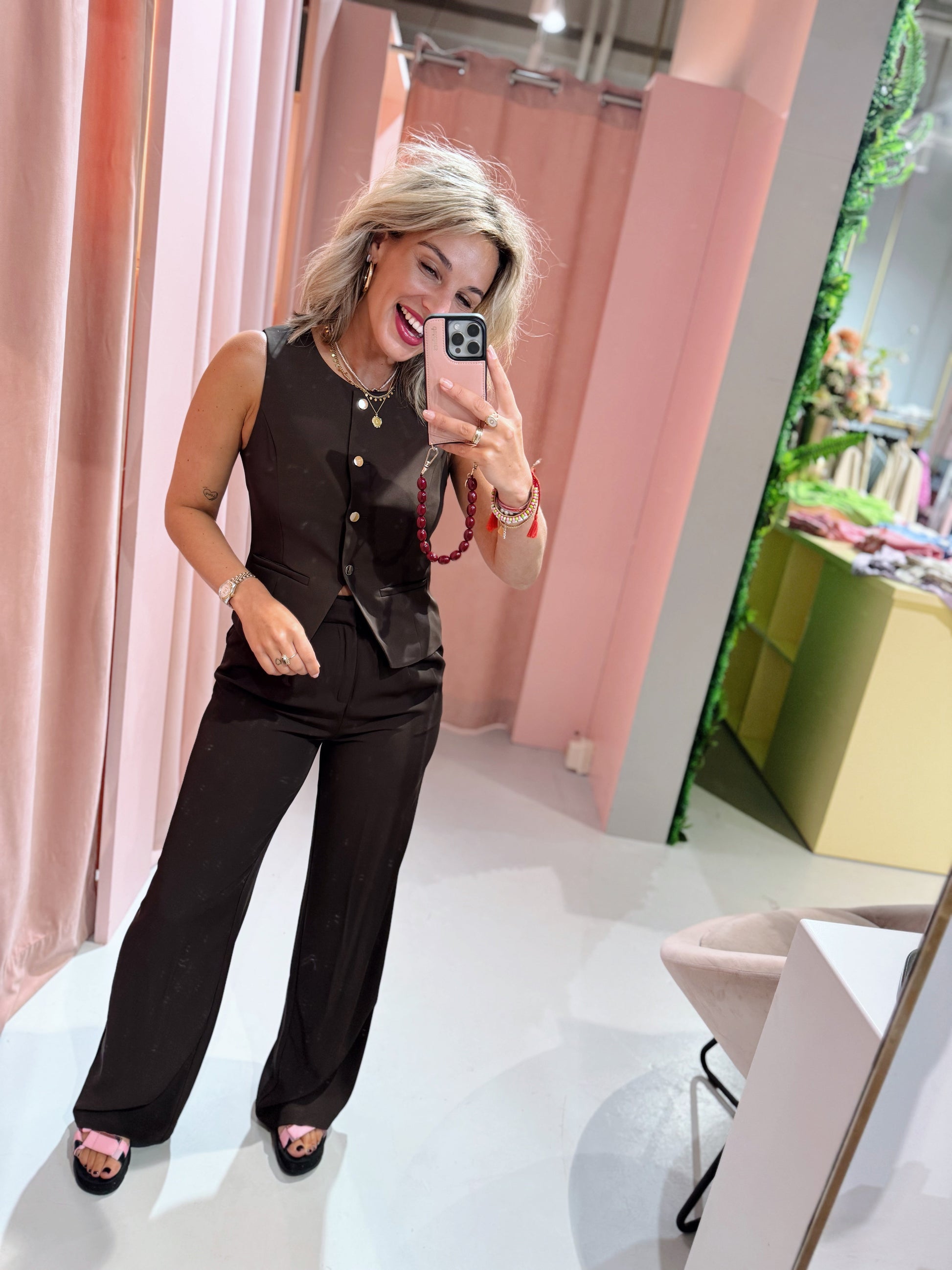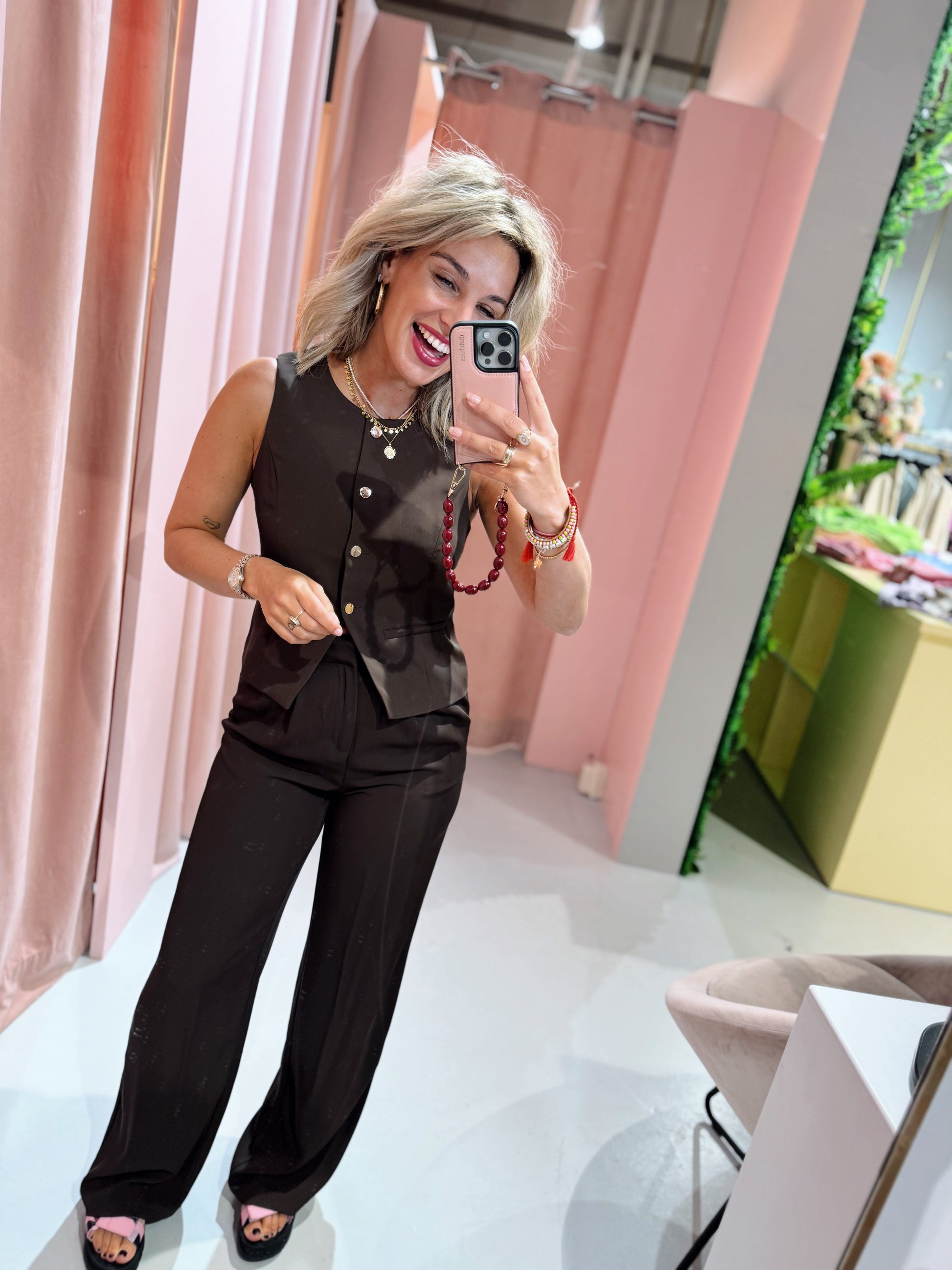 De Jill Pants in bruin is een broek met een classy uitstraling. De broek heeft een wide leg model en een dubbele knoopsluiting. Daarnaast heeft de broek twee steekzakken. Combineer deze broek met de Jill Gilet voor een complete set!