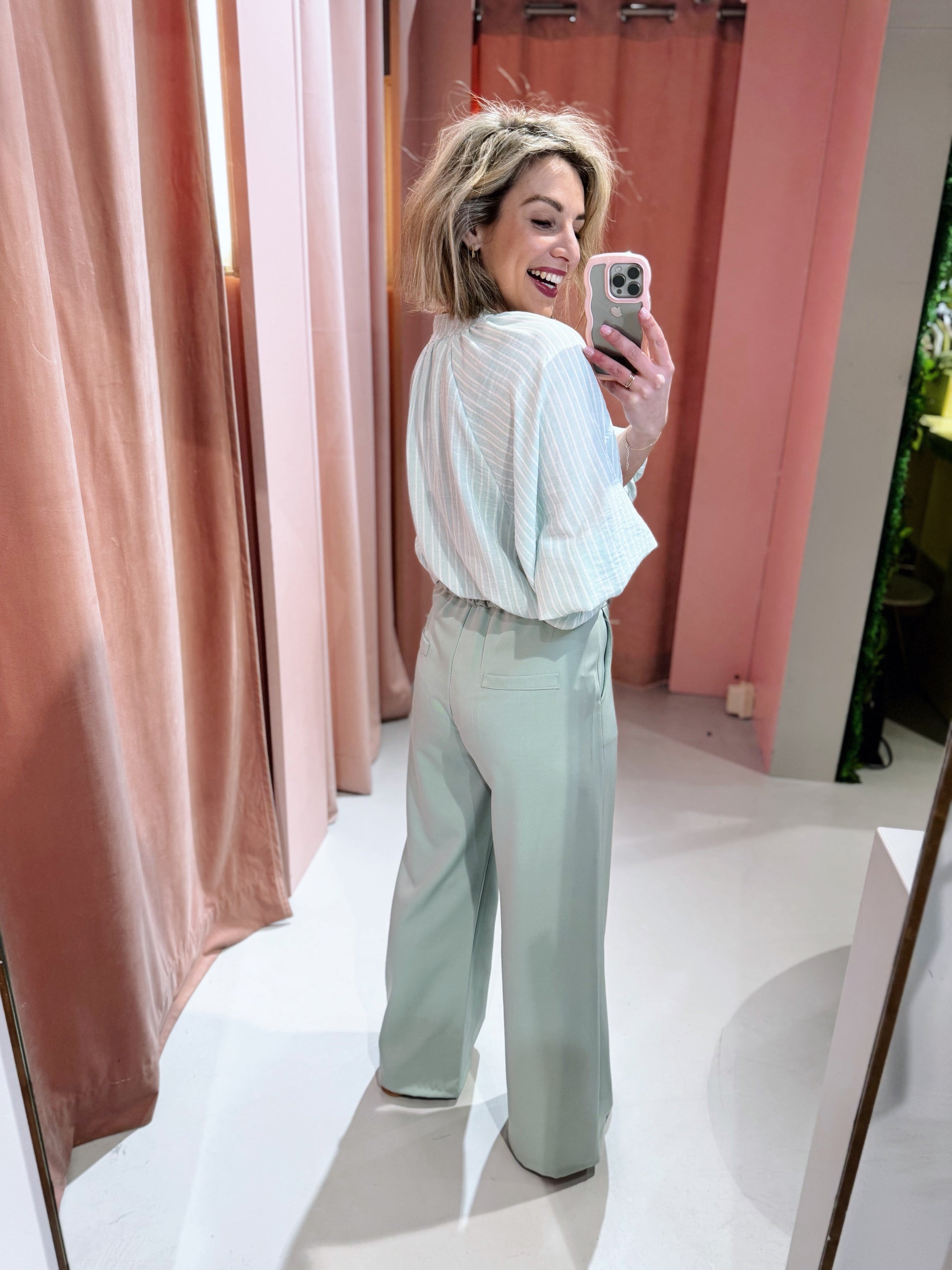 De Jody Pantalon in sage green is een stijlvolle en comfortabele broek met een high waist en een wide leg fit. De bandplooi en riemlusjes geven een verfijnde uitstraling, terwijl de elastische tailleband aan de achterkant zorgt voor extra draagcomfort. Voorzien van zakken en nep kontzakjes, een perfecte combinatie van elegantie en gemak!