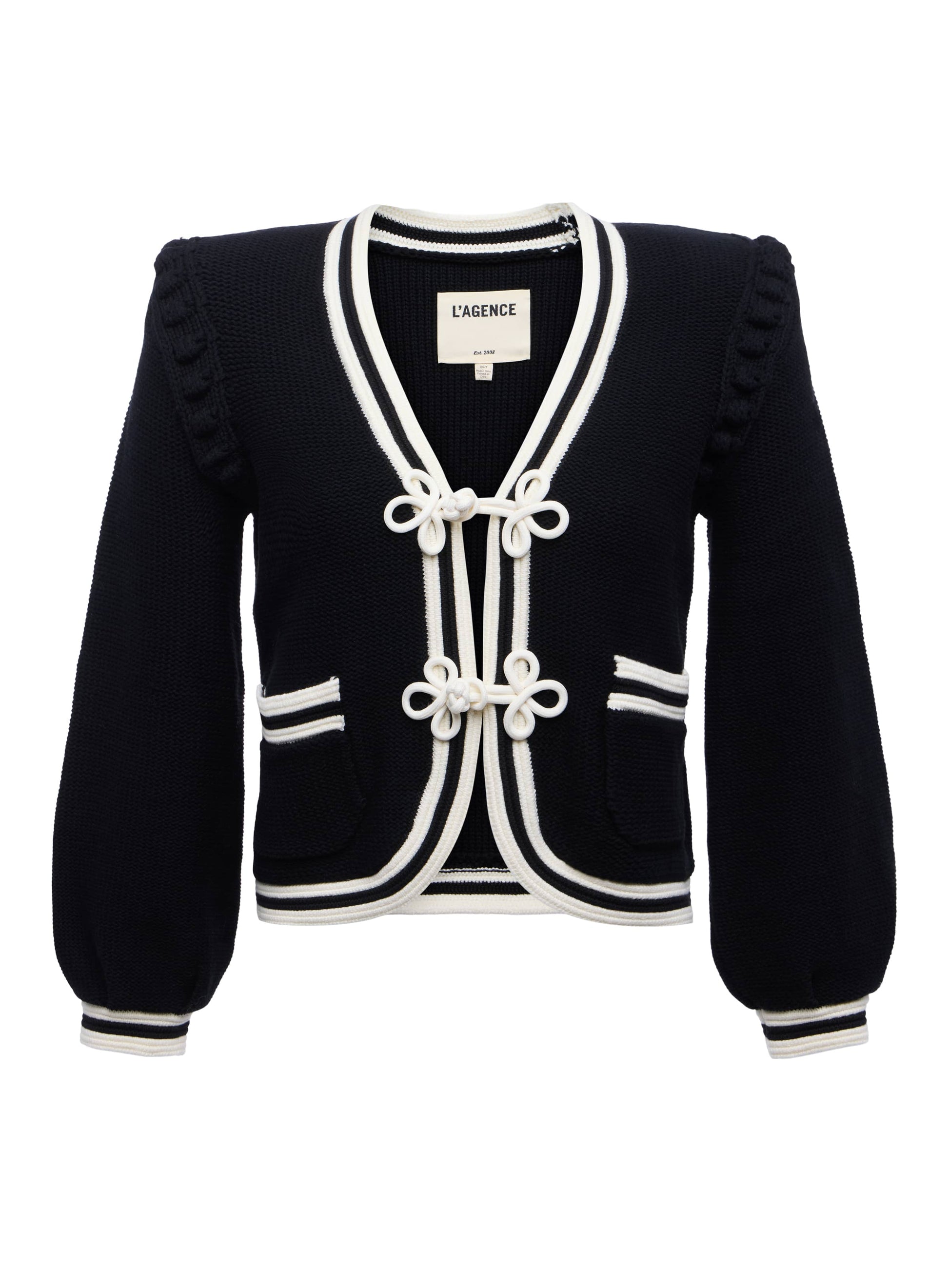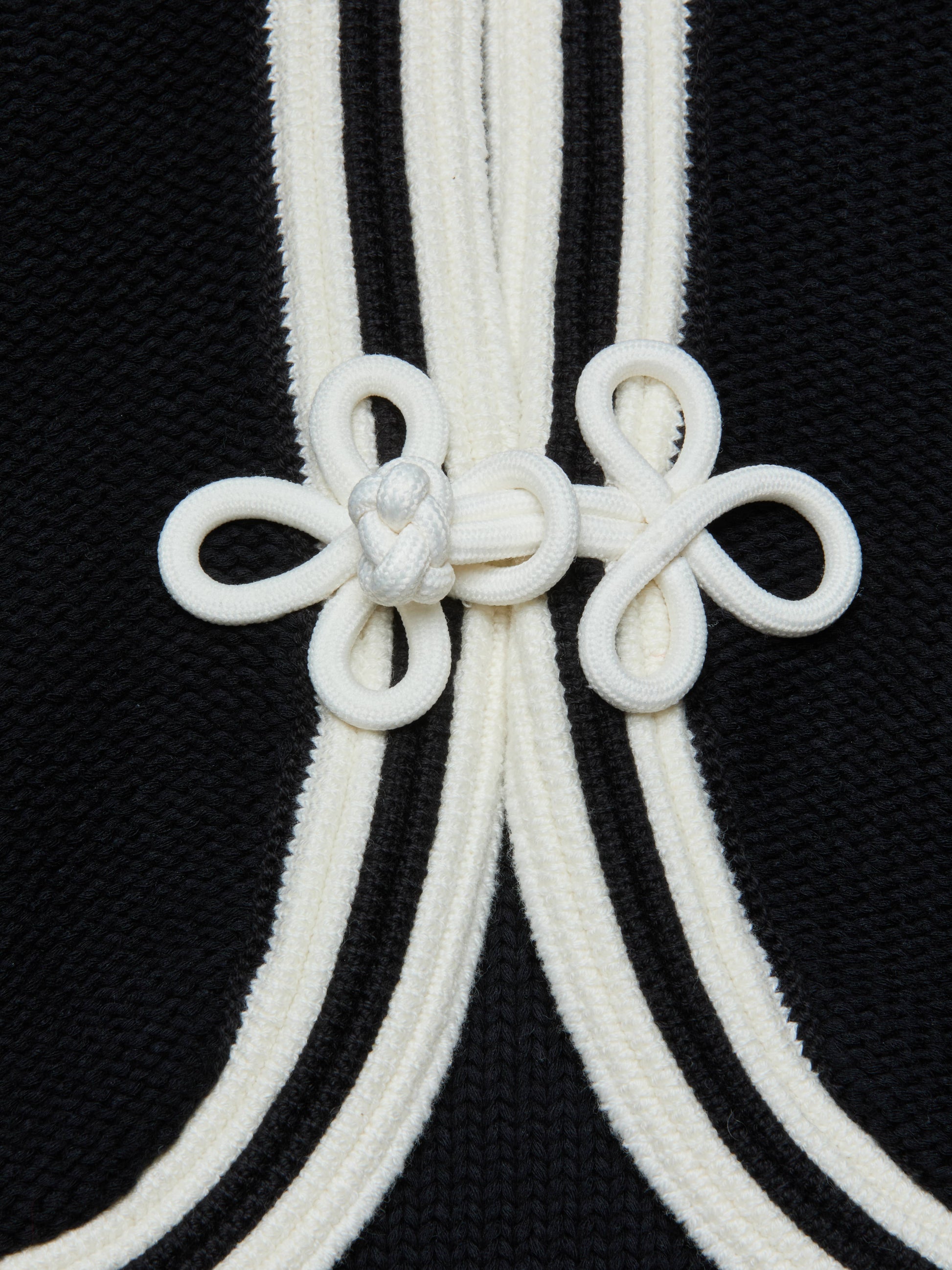 Modern and striking, the Kaito reimagines the quintessential cardigan with frog knot closures and subtle blouson sleeves. Now in black with contrasting white trim.