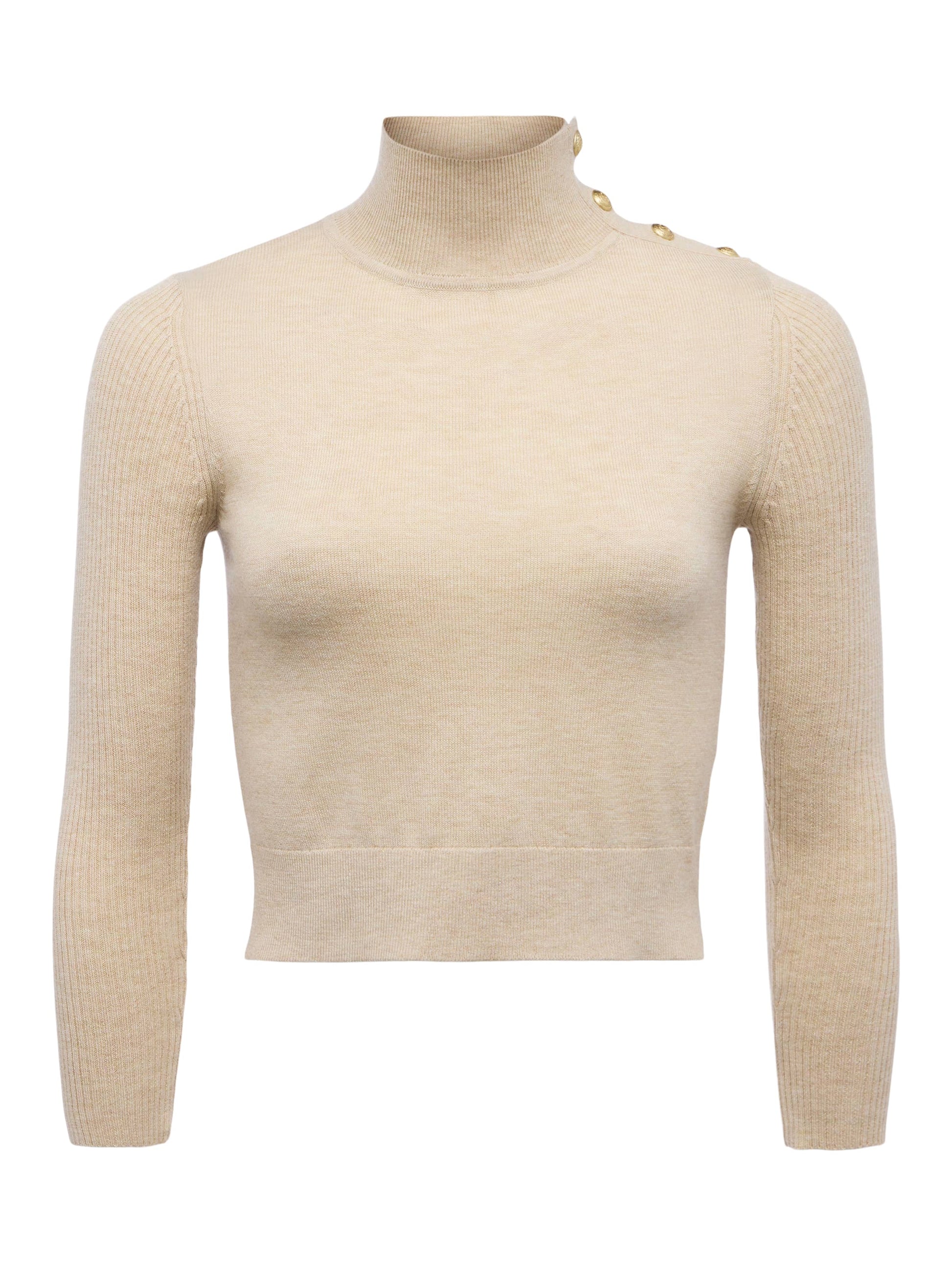 Functional snap buttons allow for this cropped pullover to be worn as a mock neck or with a folded over collar. Now in sand.