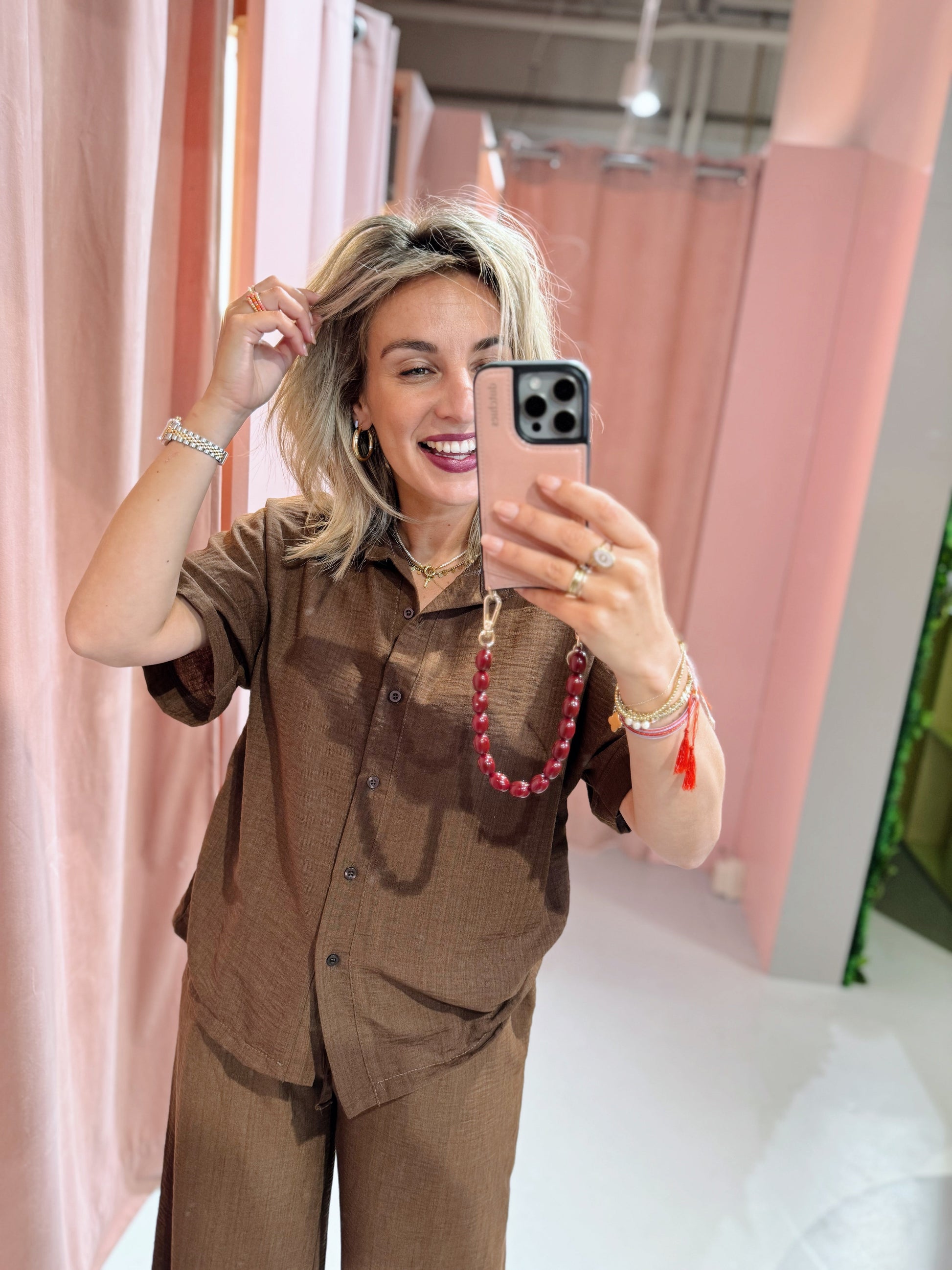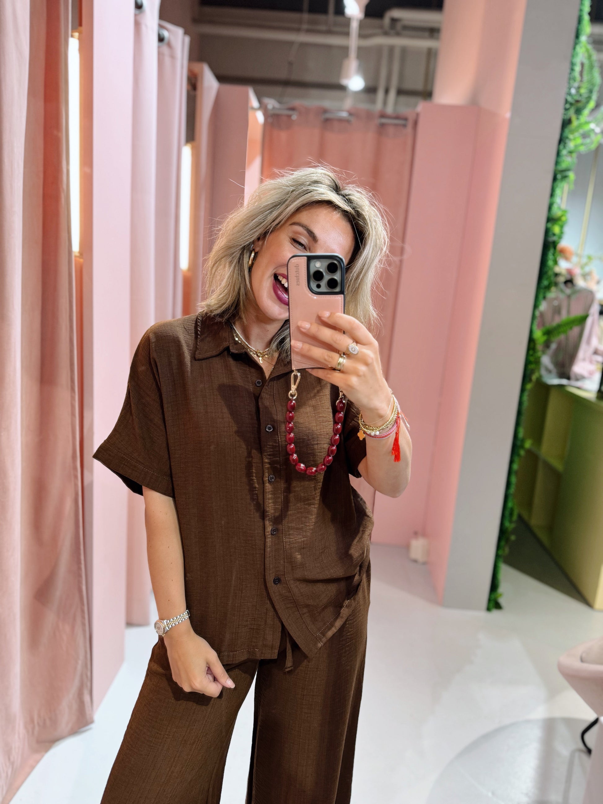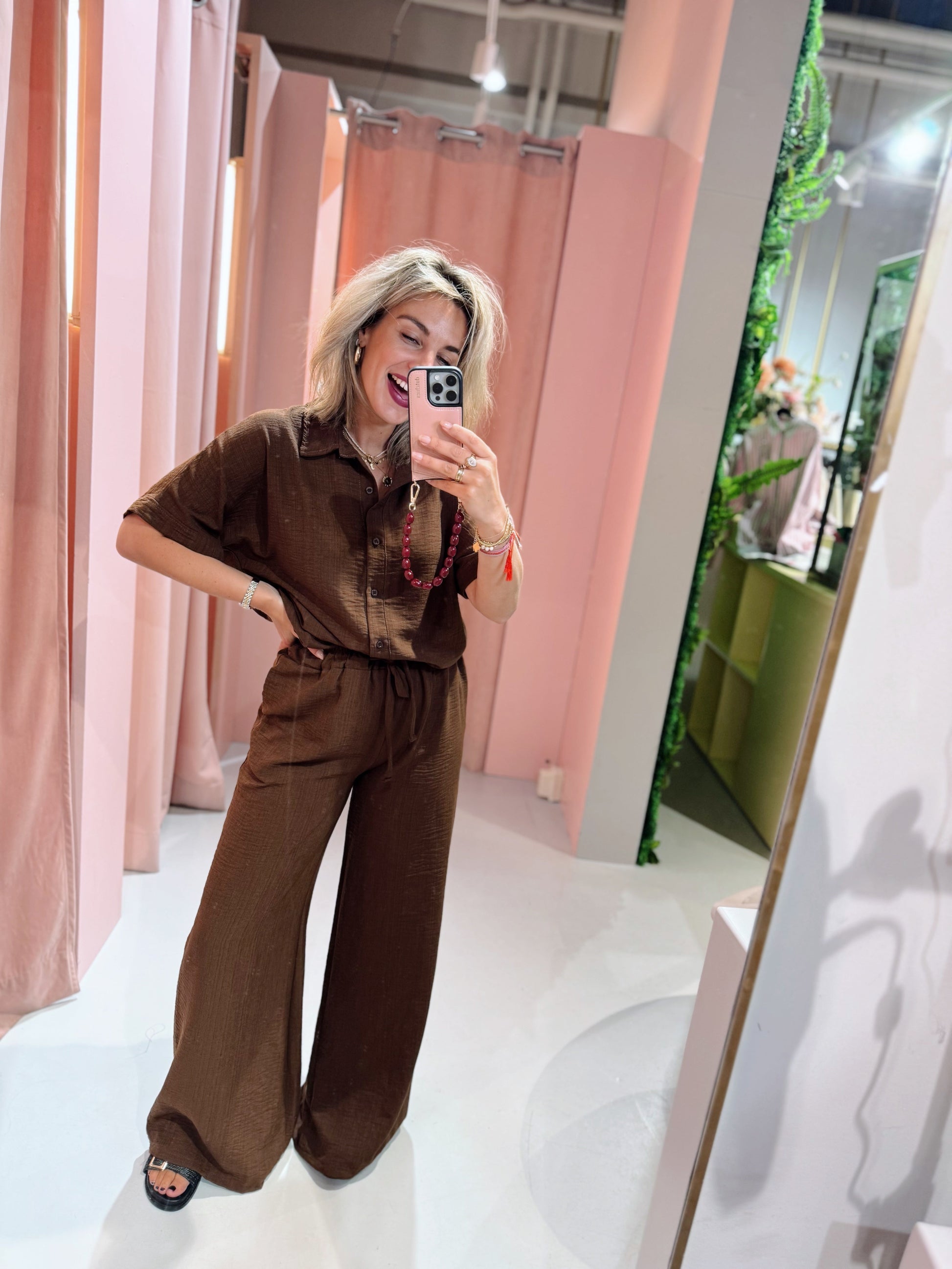 De Kiani Pants in bruin is gemaakt van een luchtige stof, hierdoor is hij perfect voor warme dagen. De broek heeft een wide leg model en is voorzien van een elastische tailleband met aantrekkoord en twee steekzakken. Combineer deze broek met de Kiani Blouse voor een complete set!