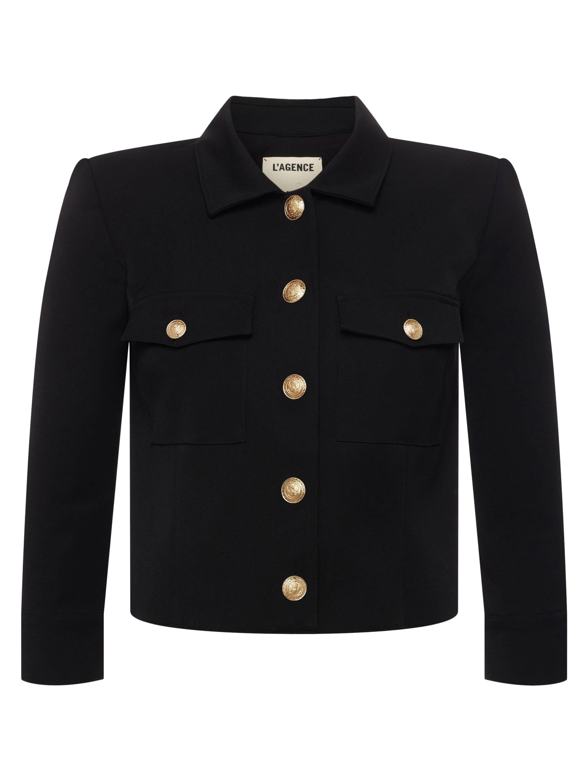 The Kumi is our modern update to the classic three-quarter sleeve jacket. A strong shoulder and tapered silhouette create flattering definition. This versatile black style is crafted from a supple stretch-suiting fabrication and finished with flap pockets and our signature gold embossed dome buttons. Pair with high-waisted denim for a perfectly proportioned look.