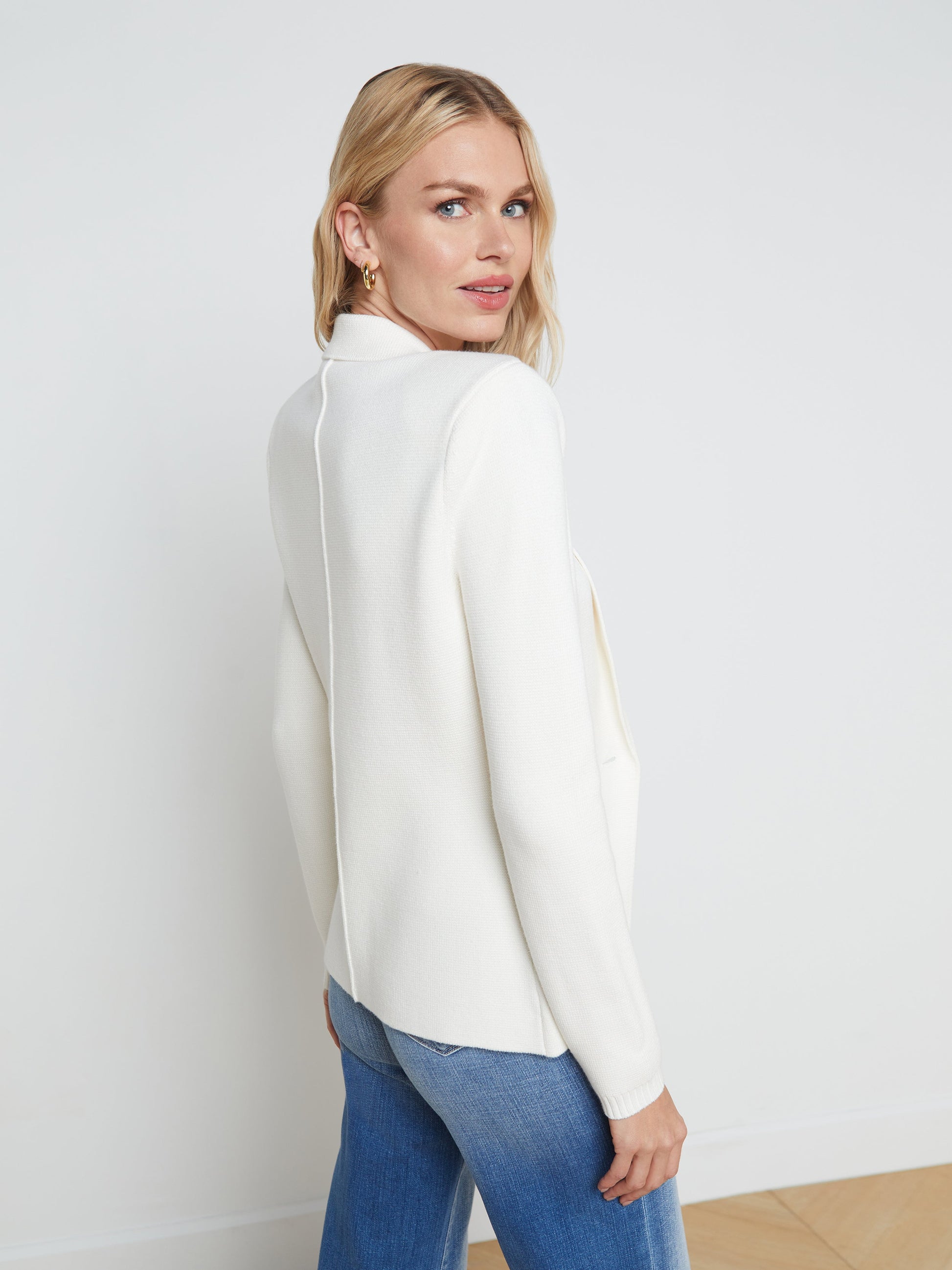An effortlessly chic knit blazer in lustrous white. Classic tailored details like lapels, shoulder pads, and patch pockets complement soft, luxurious knit done in a lightly textured stitch. Clean silhouette tapers at waist for a flatteringly sleek fit. Tonal embossed-dome button closure.