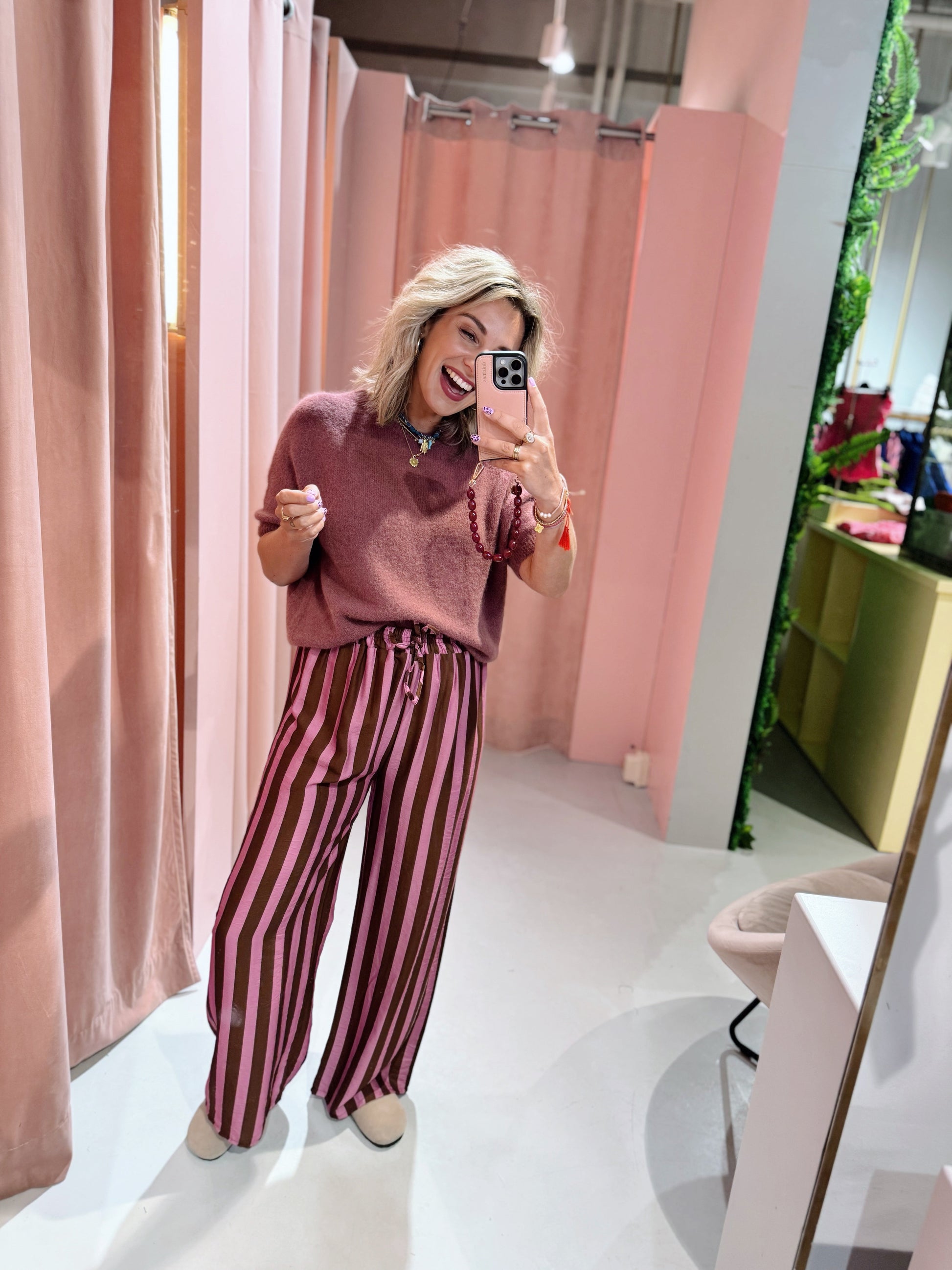 De Lilian Pants in roze/bruin is gemaakt van een luchtige stof, hierdoor is hij perfect voor warme dagen. De broek heeft een wide leg model en is voorzien van een elastische tailleband met aantrekkoord en een streep patroon. Combineer deze broek met je favoriete topje voor een leuke zomer look!