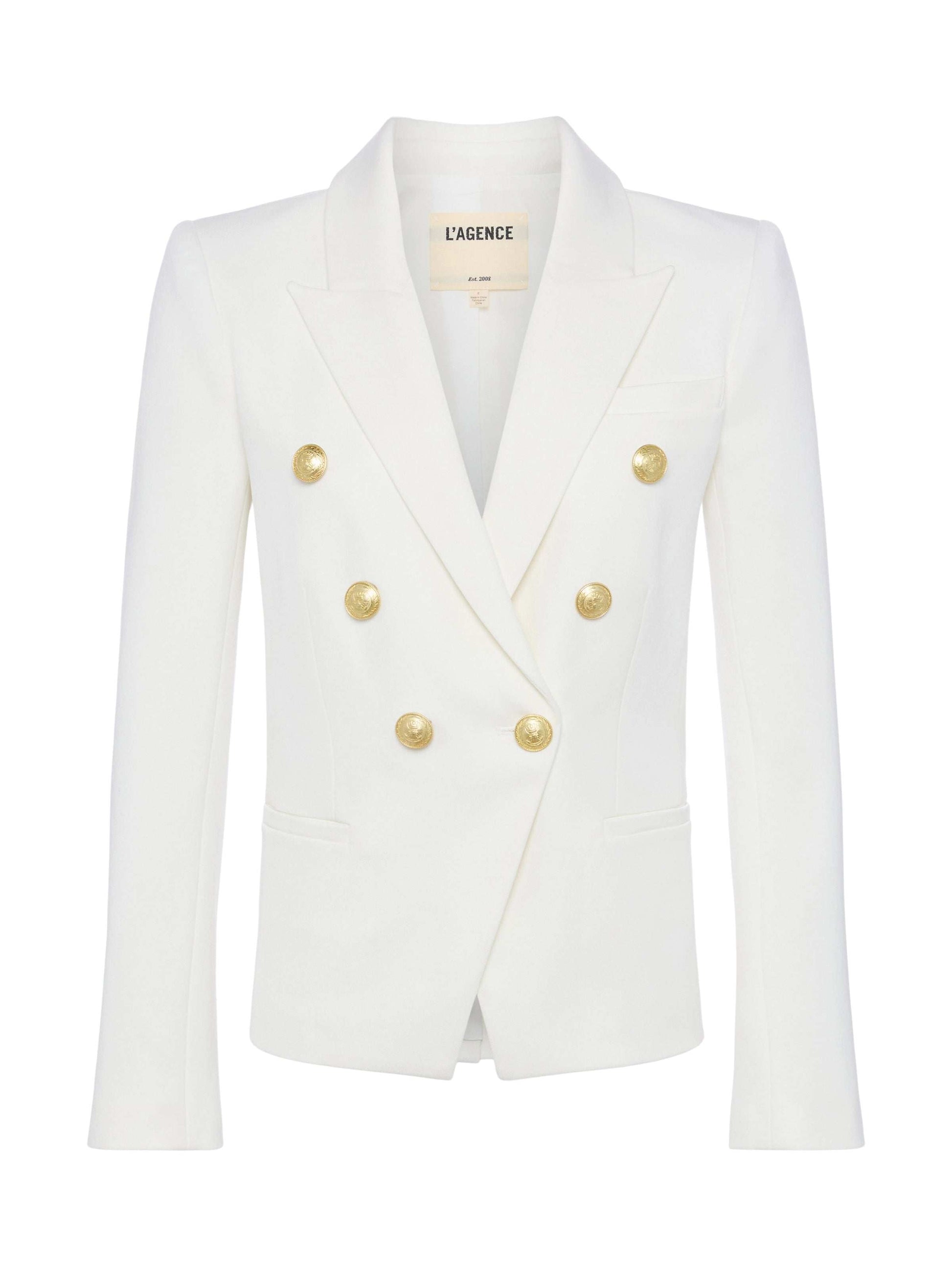 An ultra-flattering double-breasted blazer featuring a defined, cinched waist. Now in true white.