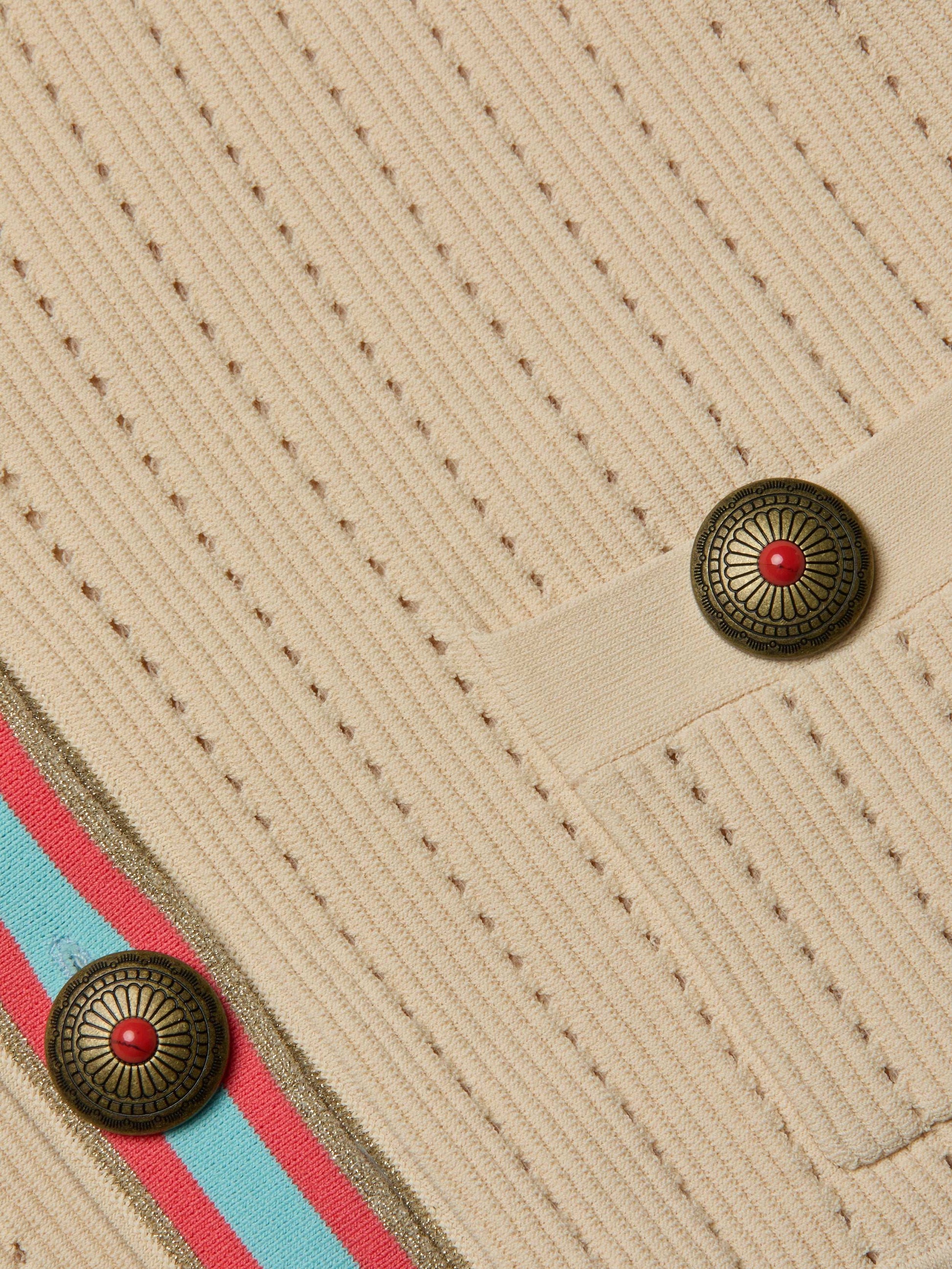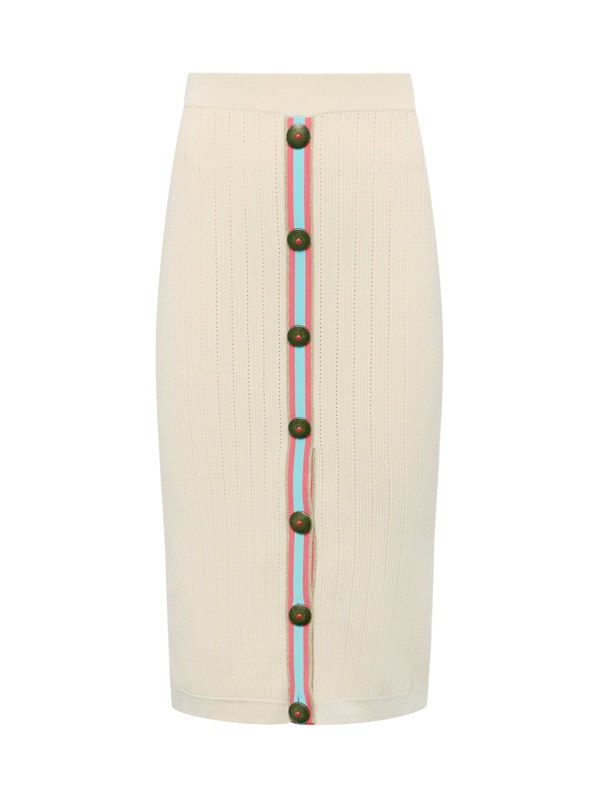 Effortless polish is yours with the Melania, a pointelle knit skirt with a sleek, body-skimming fit. Designed in a comfortable pull-on style with novel buttons and a contrast striped trim.