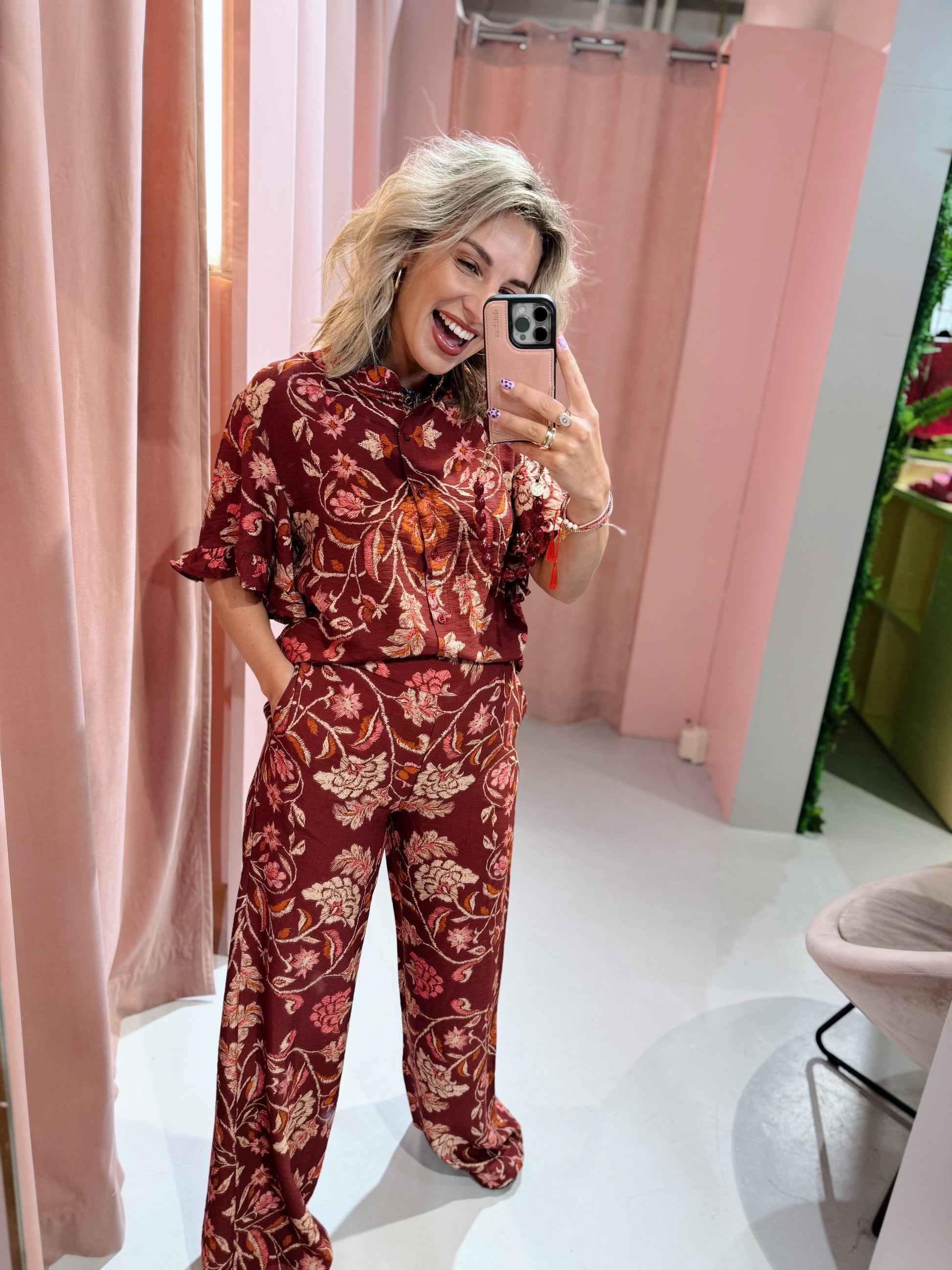 De Melody Pants in bordeaux is gemaakt van een luchtige stof, hierdoor is hij perfect voor warme dagen. De broek heeft een wide leg model en is voorzien van een elastische tailleband aan de achterkant en twee steekzakken. Bovendien is de broek voorzien van een bloemenprint. Combineer deze broek met de Melody Blouse voor een complete set!