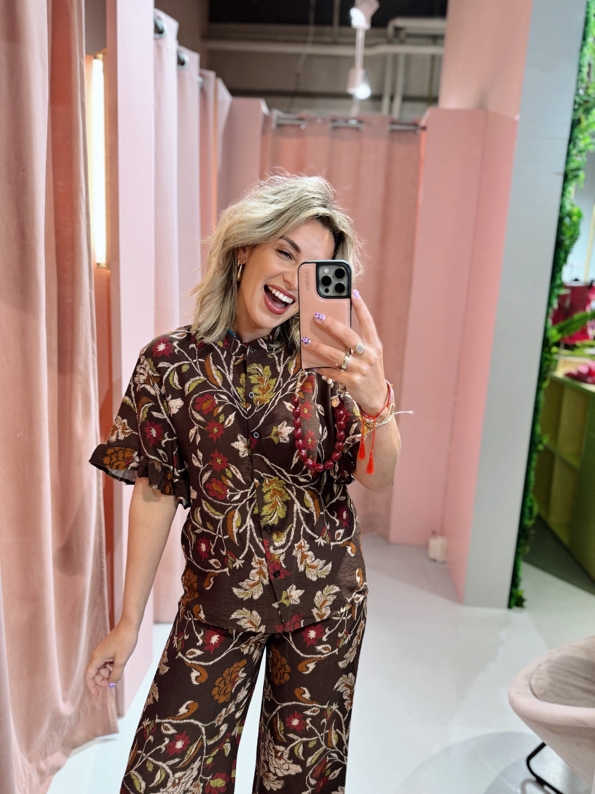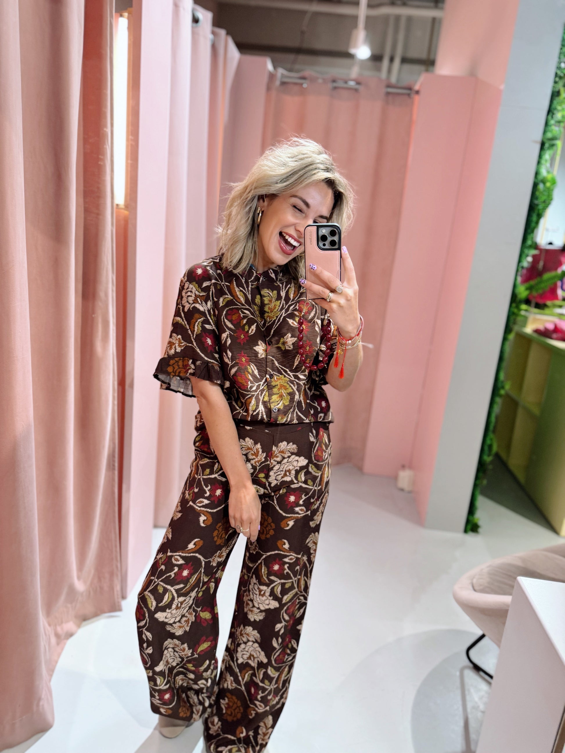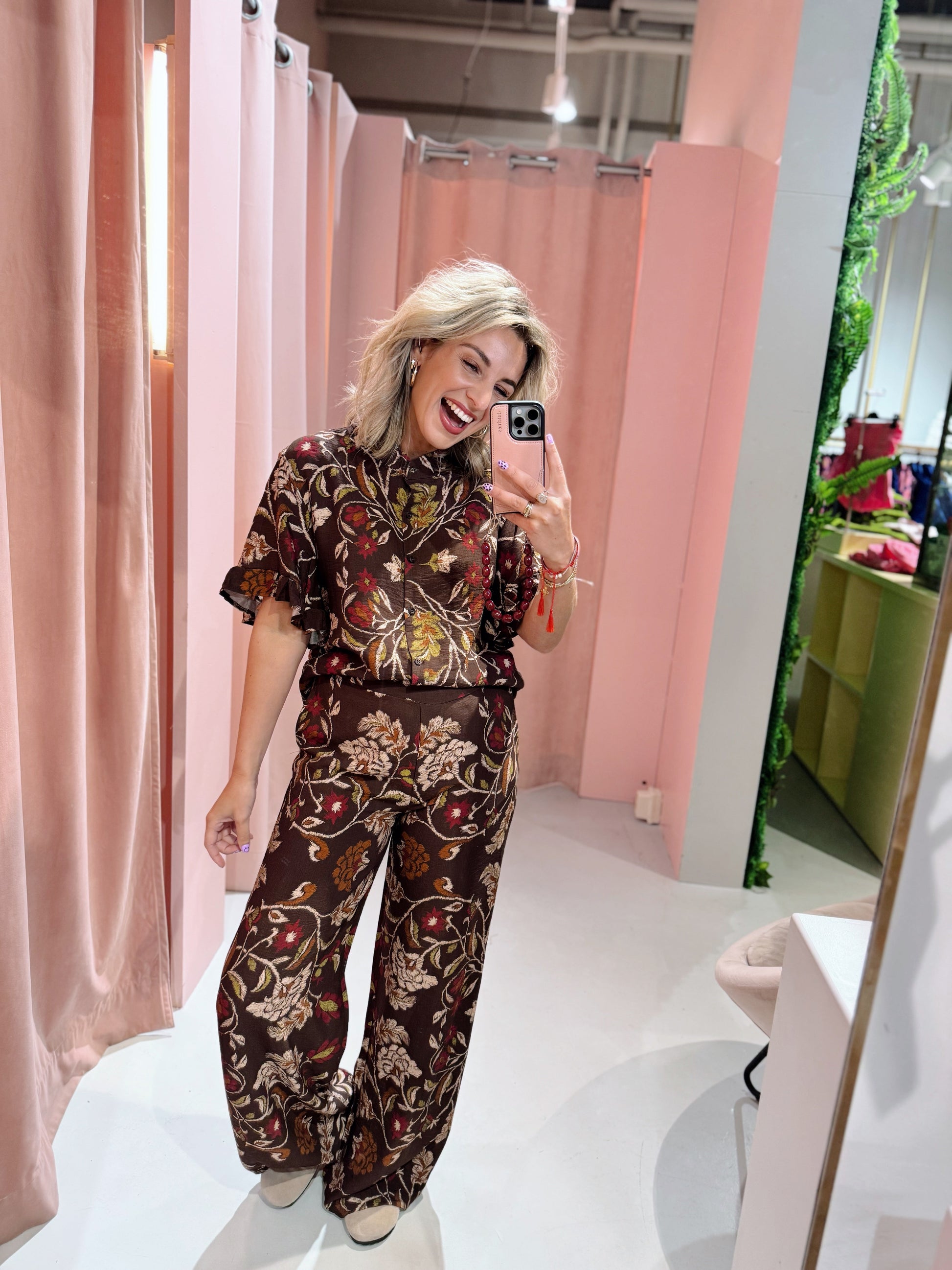 De Melody Pants in bruin is gemaakt van een luchtige stof, hierdoor is hij perfect voor warme dagen. De broek heeft een wide leg model en is voorzien van een elastische tailleband aan de achterkant en twee steekzakken. Bovendien is de broek voorzien van een bloemenprint. Combineer deze broek met de Melody Blouse voor een complete set!