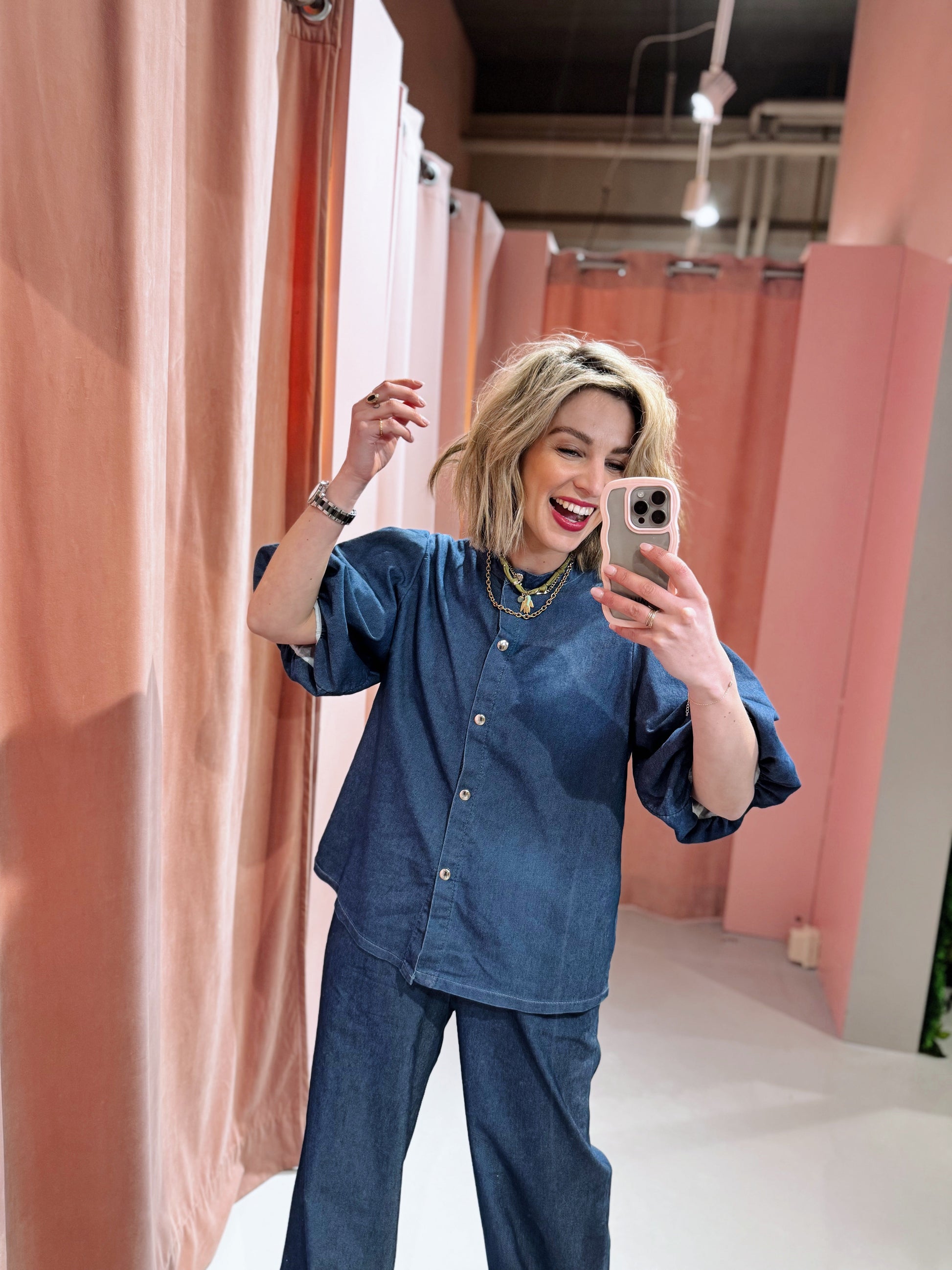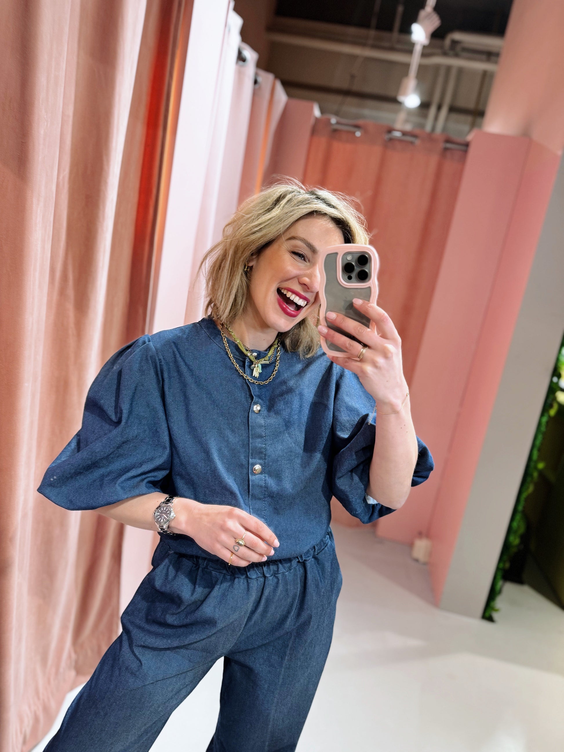 De Milou Pants is gemaakt van een denim stof en heeft een wide leg model met twee steekzakken. Doordat de broek een elastische tailleband heeft, draagt hij erg comfortabel. Combineer de Milou Pants met de Milou Blouse voor een complete set.