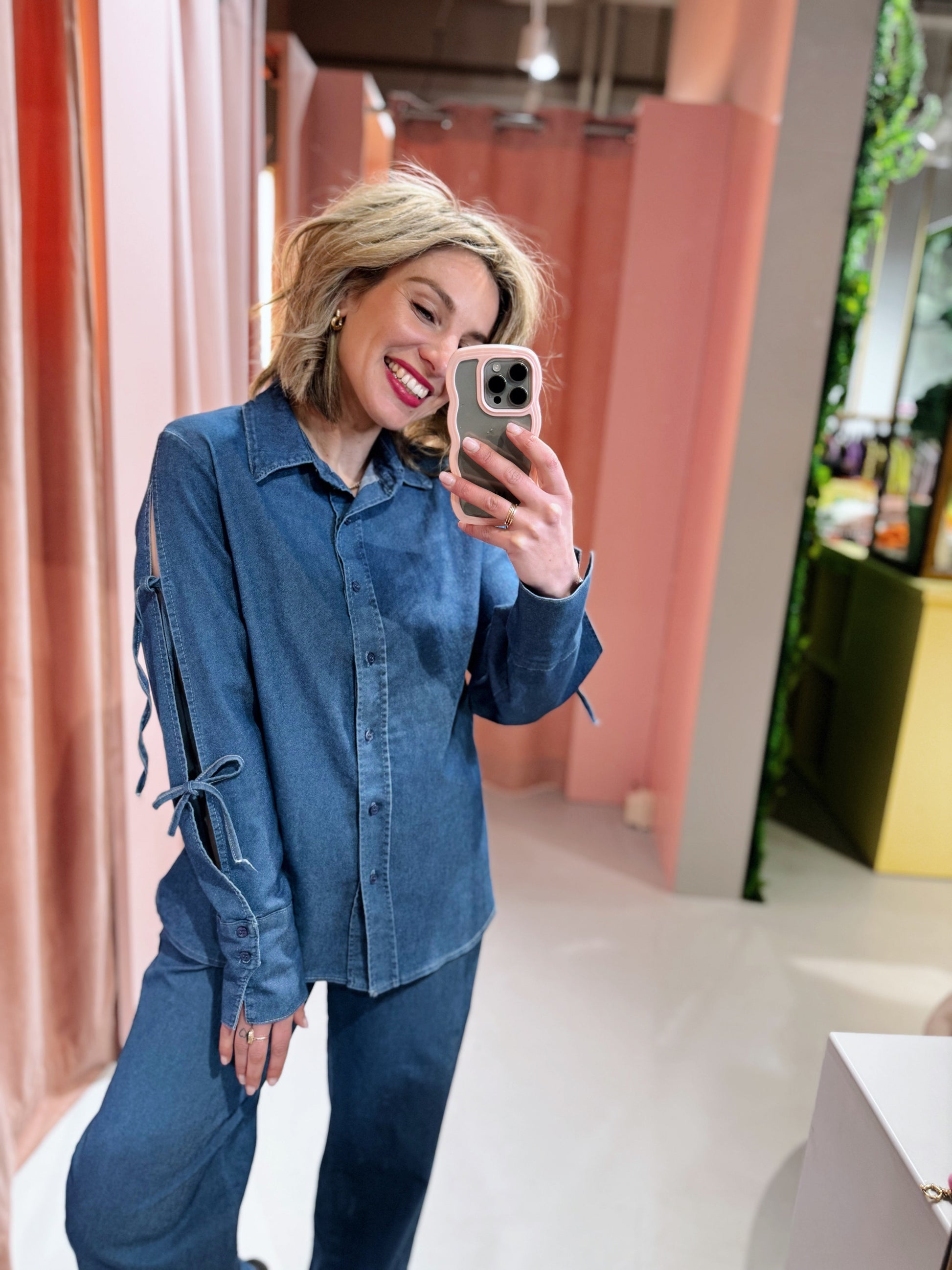 De Nadia Pants in donkerblauw is gemaakt van een denim stof en heeft een wide leg model met twee steekzakken. Doordat de broek een elastische tailleband met aantrekkoord heeft, draagt hij erg comfortabel. Combineer de Nadia Pants met de Nadia Blouse voor een complete set.
