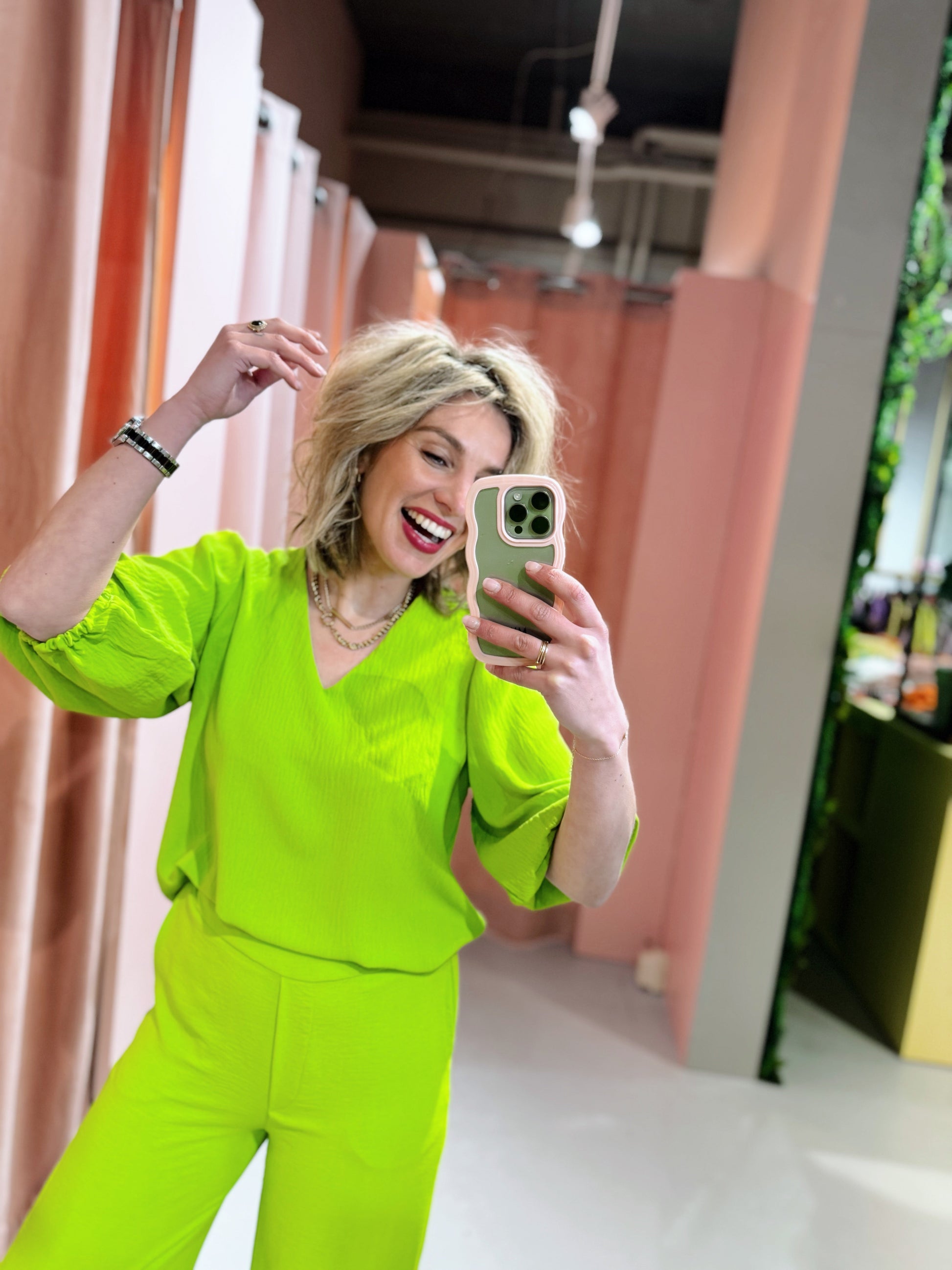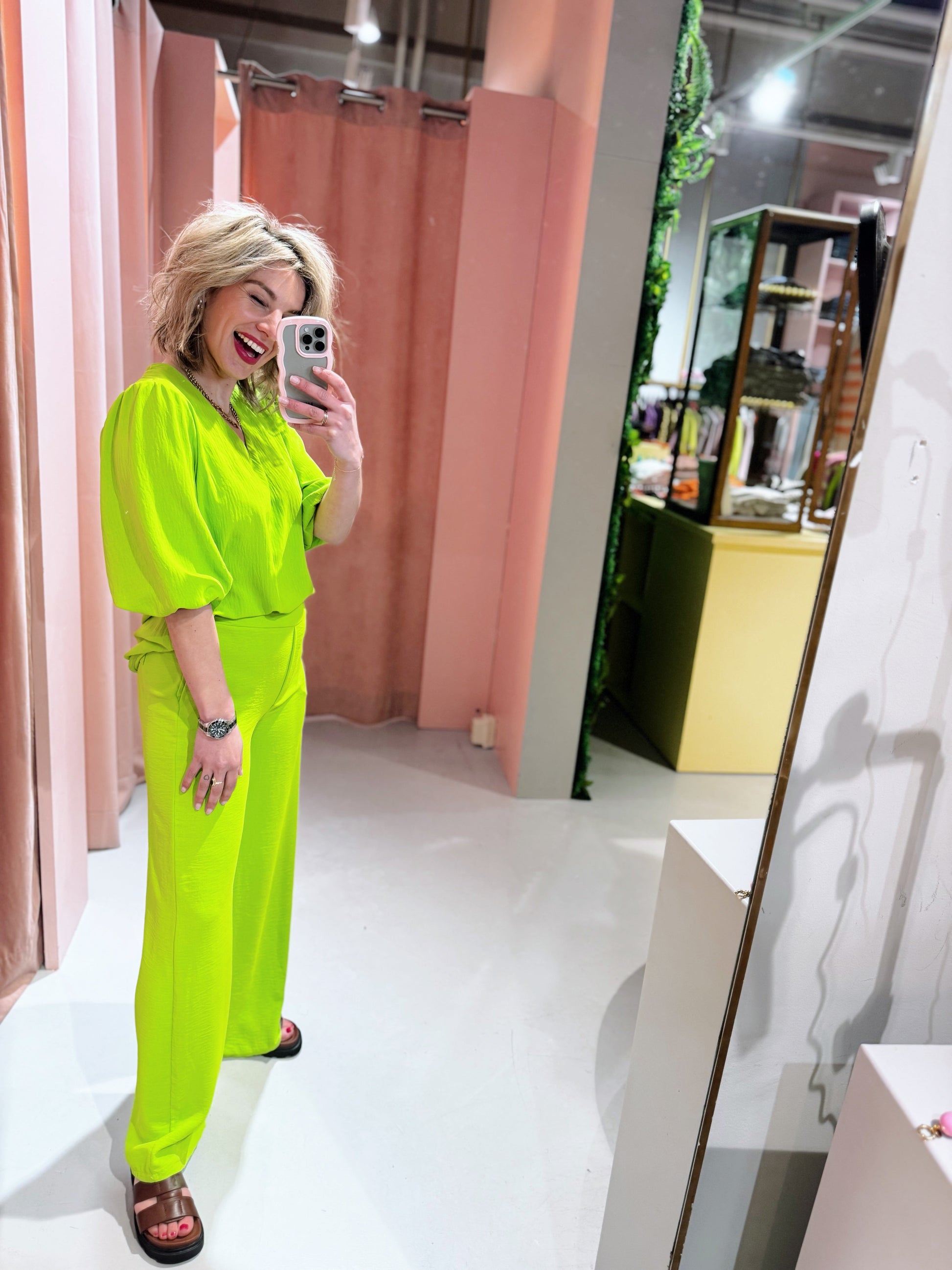 De Ora Pants in lime is een comfortabele broek met een wide leg model. De broek heeft een elastische tailleband en twee nepzakken aan de achterkant en is voorzien van twee steekzakken. Combineer de Ora Pants met de Ora Blouse voor een complete set.