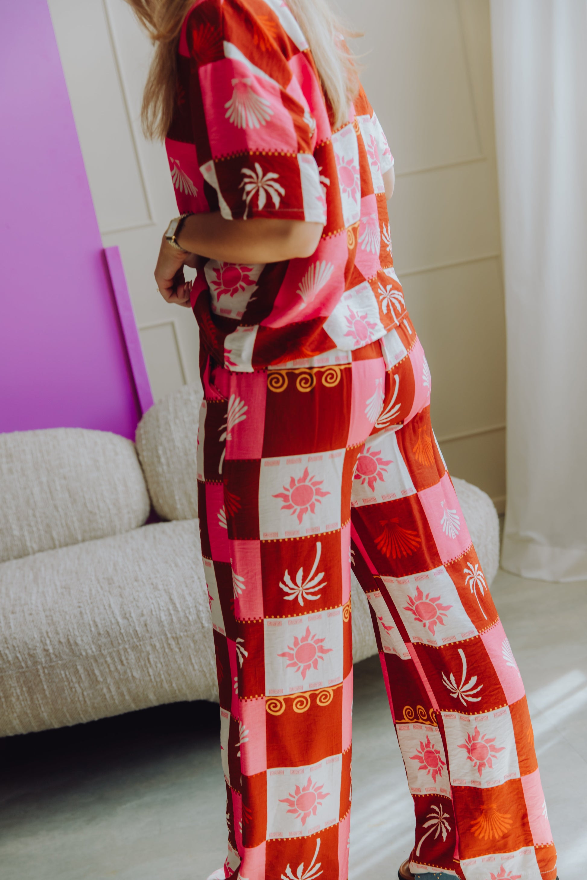 De Palm Pants in roze is gemaakt van een luchtige stof, hierdoor is hij perfect voor warme dagen. De broek heeft een wide leg model en is voorzien van een elastische tailleband met aantrekkoord en twee steekzakken. Bovendien is de broek voorzien van een zomers design. Combineer deze broek met de Palm Blouse voor een complete set!