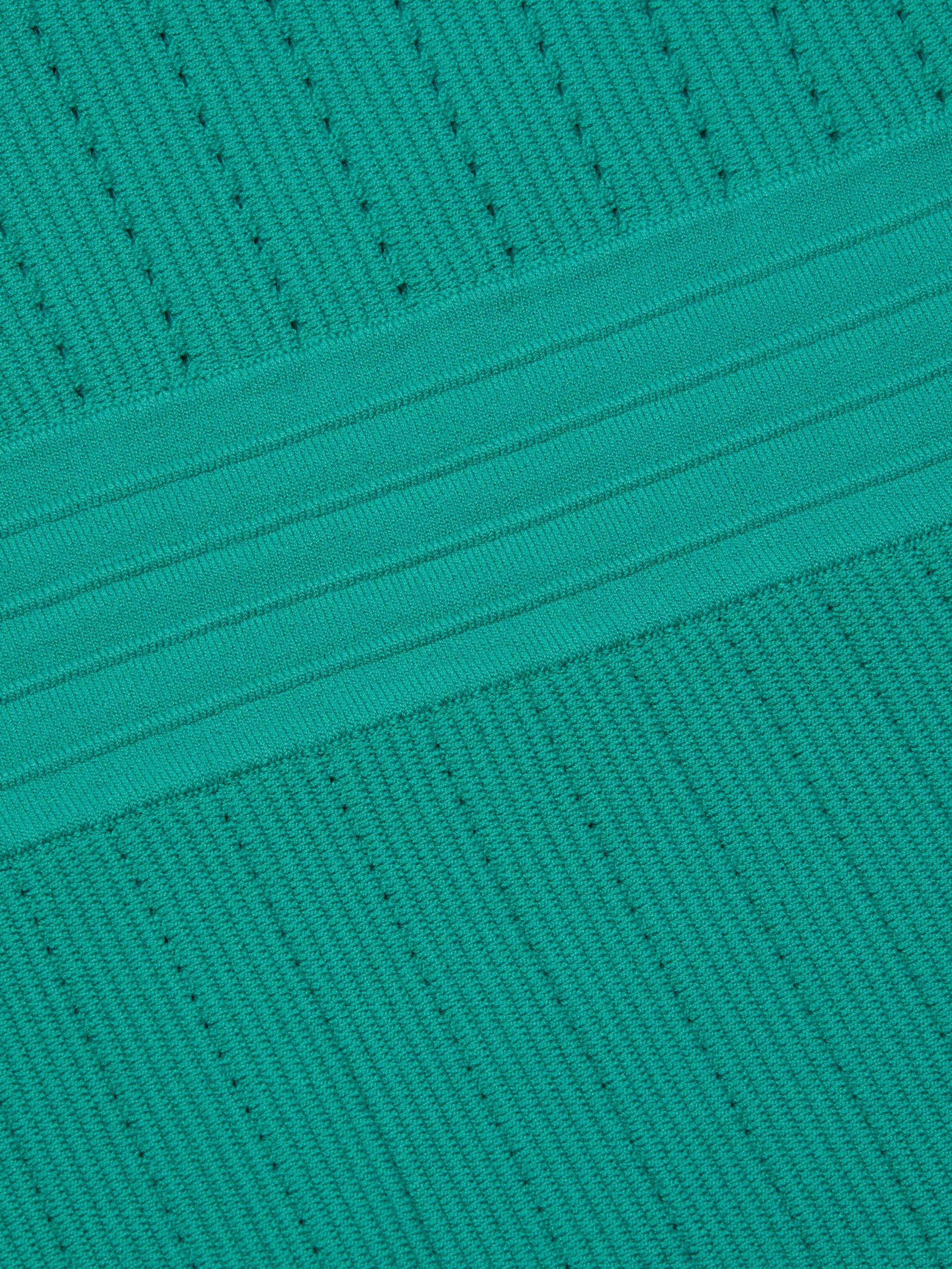 The Rehannin is a fitted pointelle knit dress in a vibrant lagoon hue, featuring a ribbed waistband for a flattering silhouette. Wear alone or with its coordinating cardigan.
