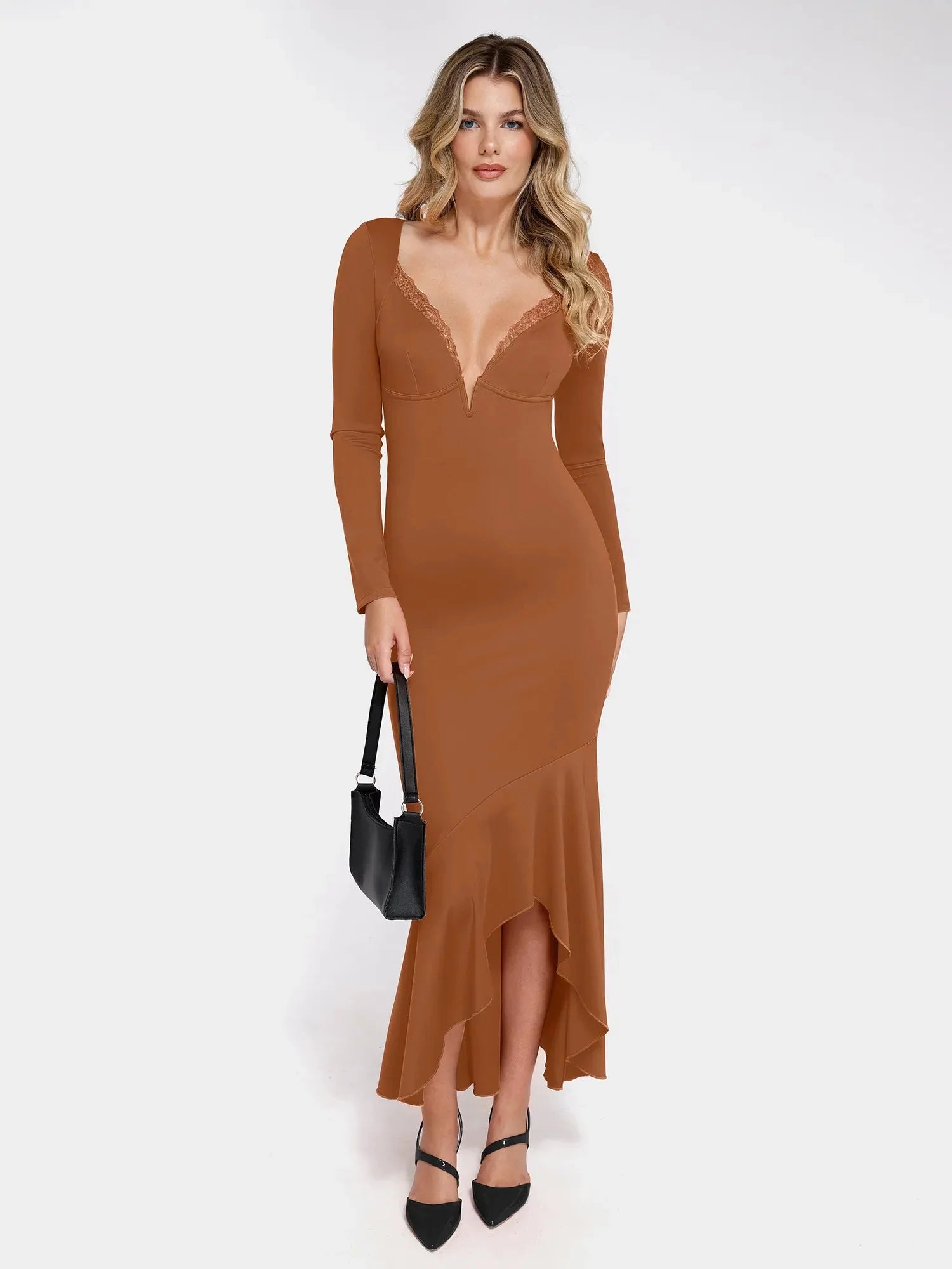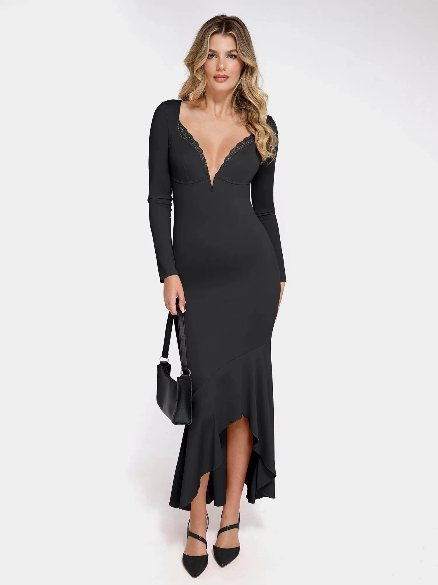 Shapewear Long Sleeve Lace Trim Sculpting Mermaid Maxi Dress