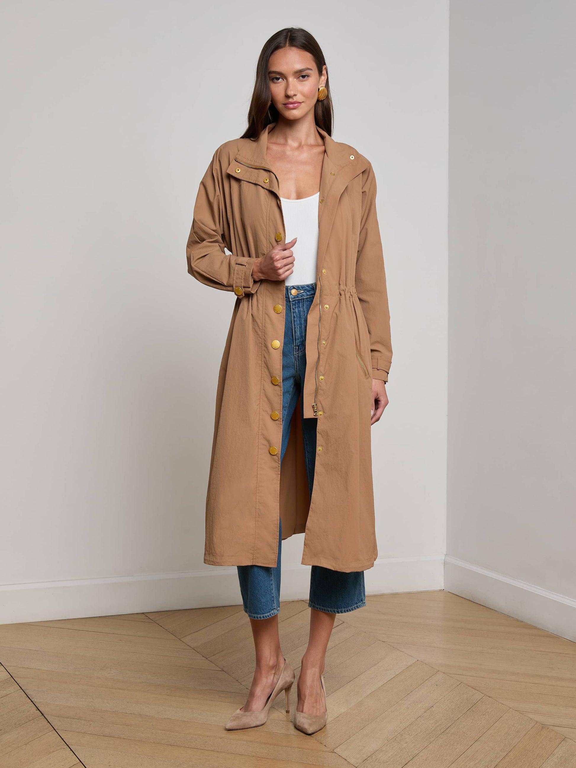 Meet your most sophisticated windbreaker, now in neutral tan. The Toshi features a full-length trench silhouette with a flattering cinched waist and luxe gold hardware. Constructed with a water repellant finish, this effortlessly stylish and functional piece is sure to be your wardrobe hero for years to come.
