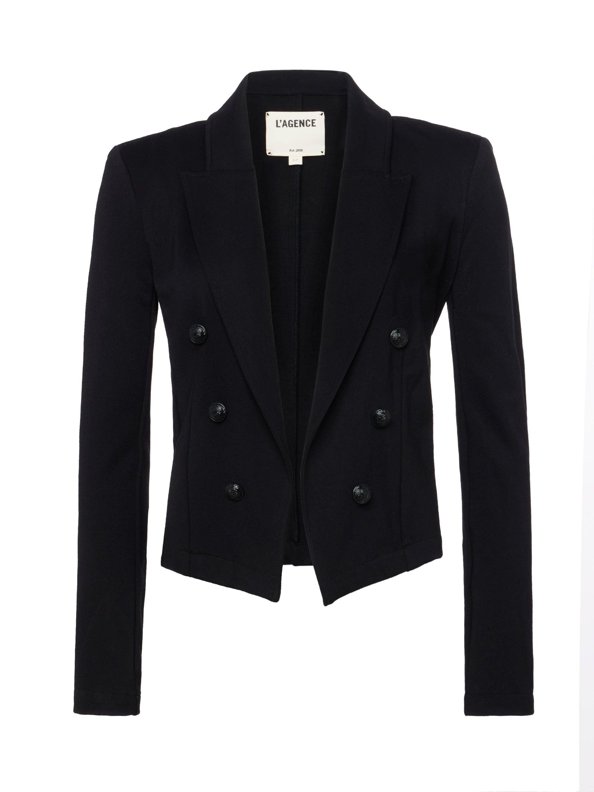 A polished open-front seersucker jacket in black. Sartorial details include strong shoulders and peaked lapels. Seaming tapers style to waist, creating a feminine silhouette. Finished with tonal embossed-dome accent buttons. No closures.