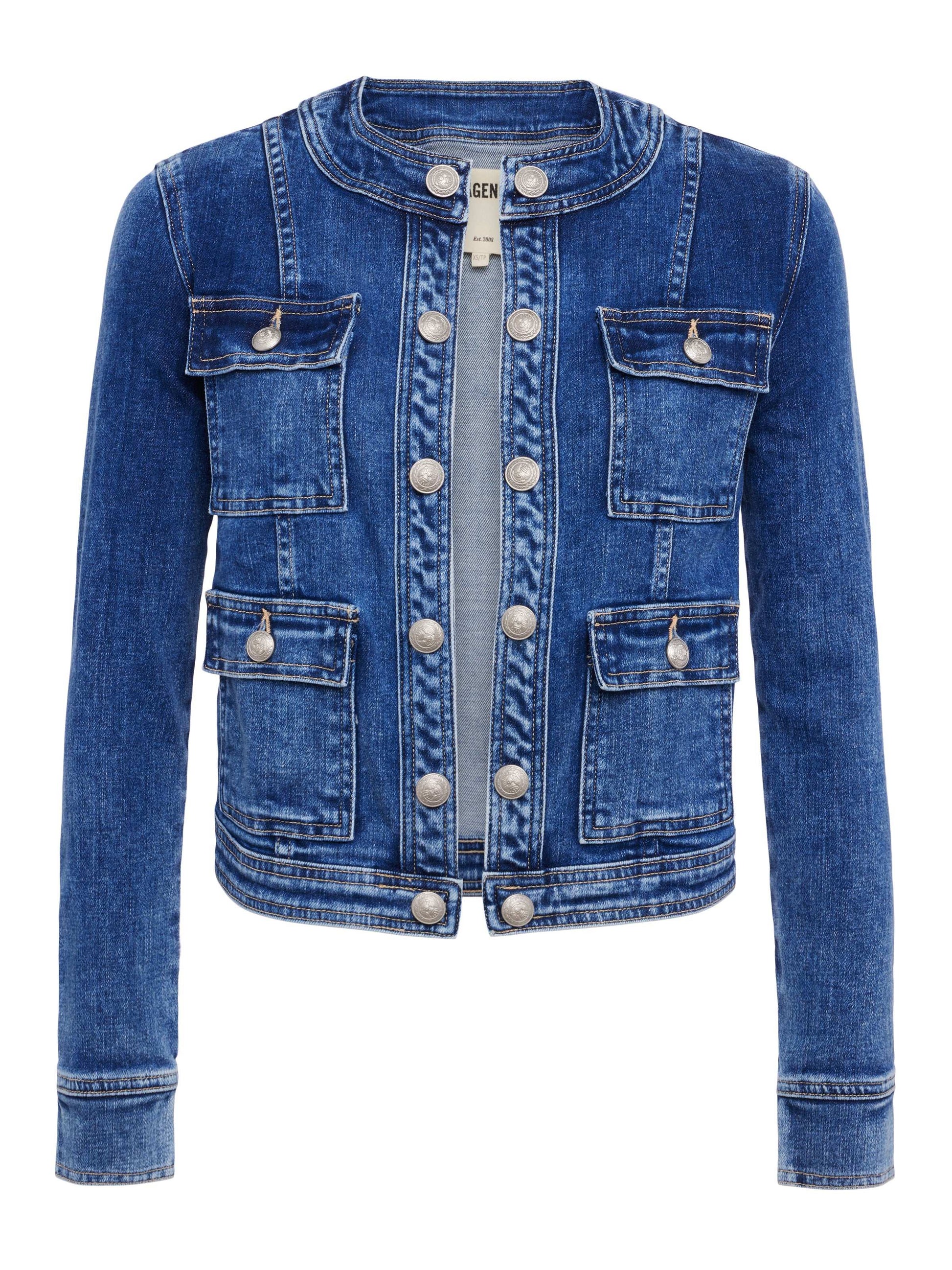 A classic collarless jacket in medium-blue premium stretch denim with subtle aging. Meticulous workmanship echoed in contrast-stitched banded edges and flap-patch pockets. Subtly shaped waist creates a flattering silhouette. With silver embossed-dome accent buttons. No closures.