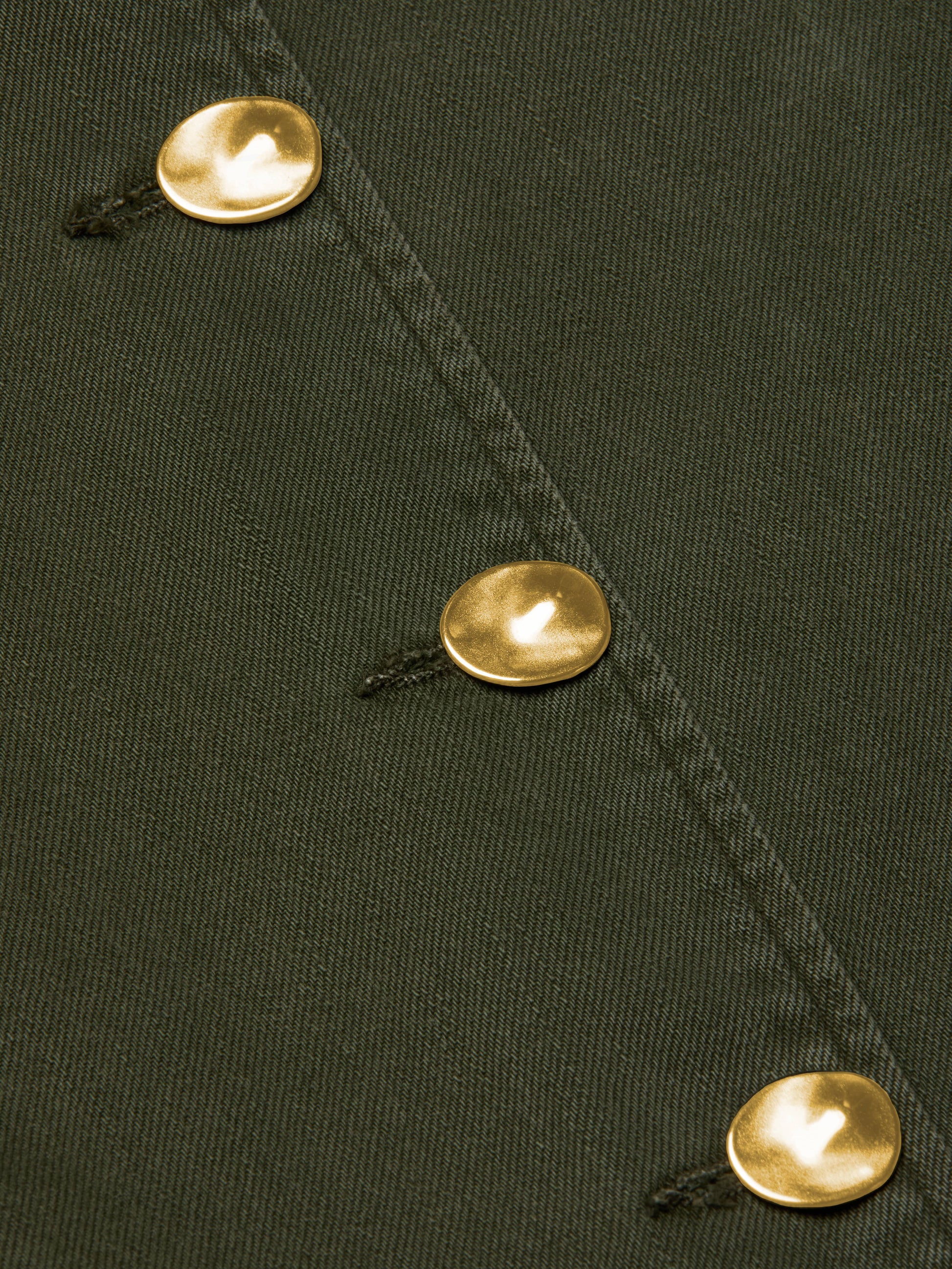The must-have trench of the season. Introducing the Zavia, a refined denim trench constructed with an oversized collar and lapels, epaulets, and lightly padded shoulders for a strong silhouette, cinched together by a waist tie belt. Matte gold buttons elevate the clean silhouette with a luxe finish. Now in dark green.